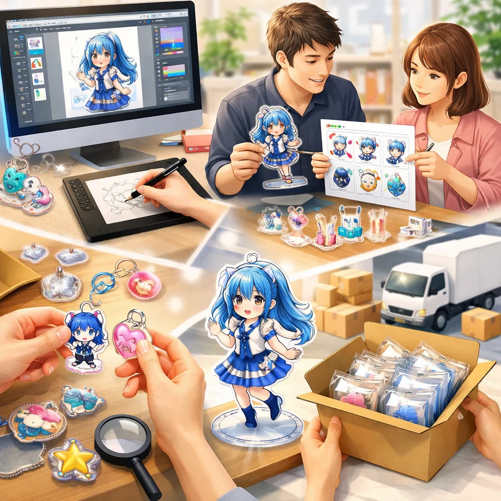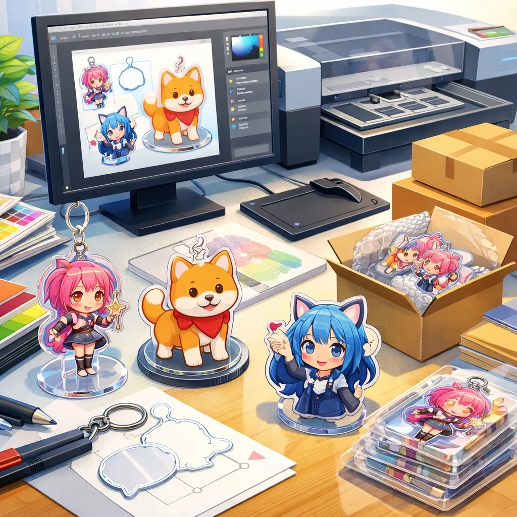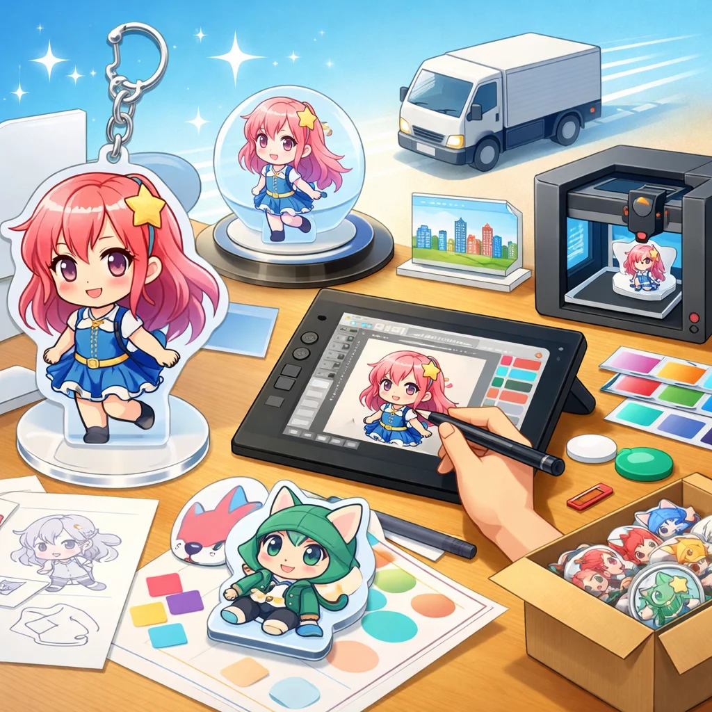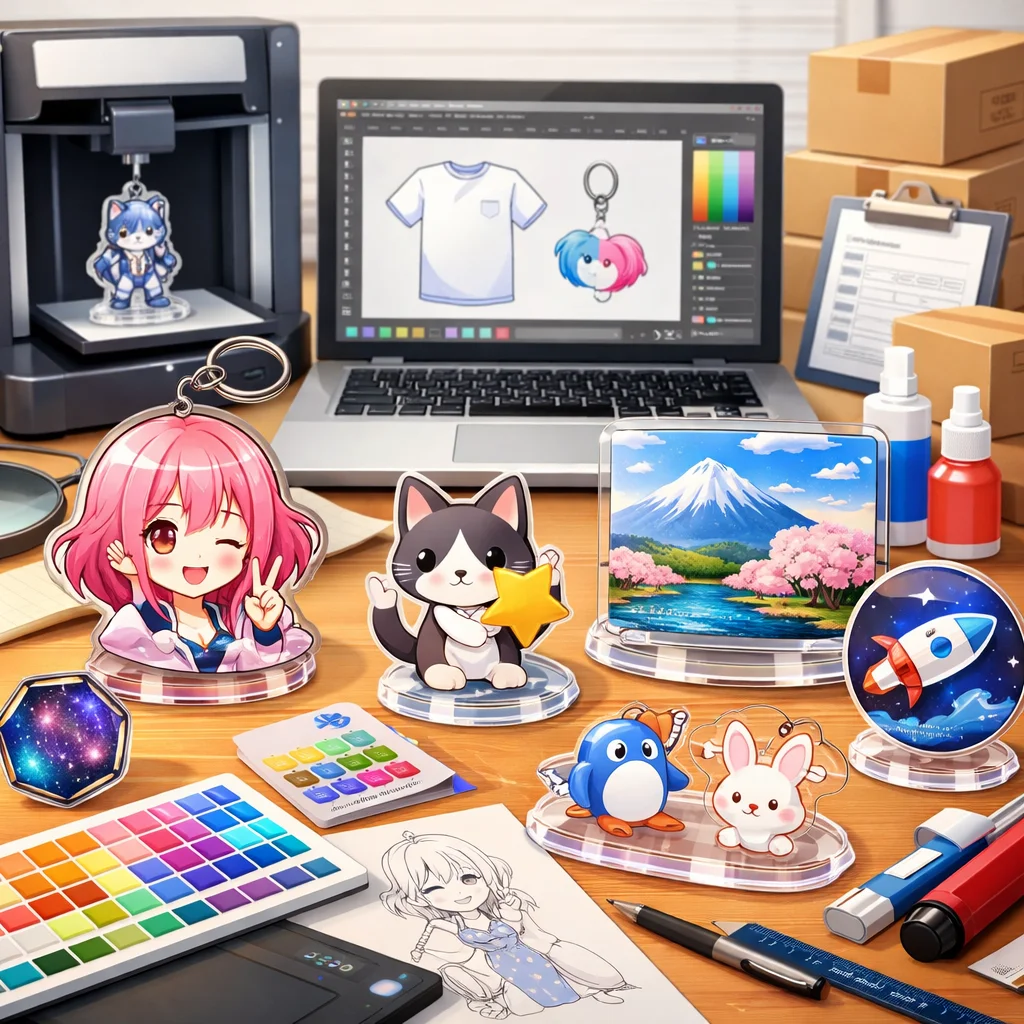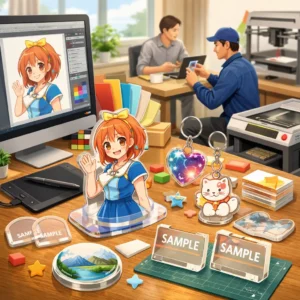 アクリルグッズの製作において、デザインの作成から入稿サポート、試作、そして発注までの一連の流れを理解し、各ステップで適切な対応を行うことで、満足のいく製品を手に入れることができます。