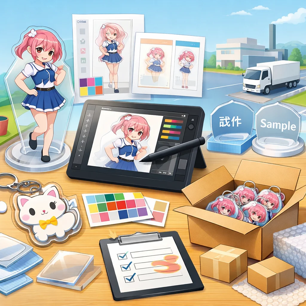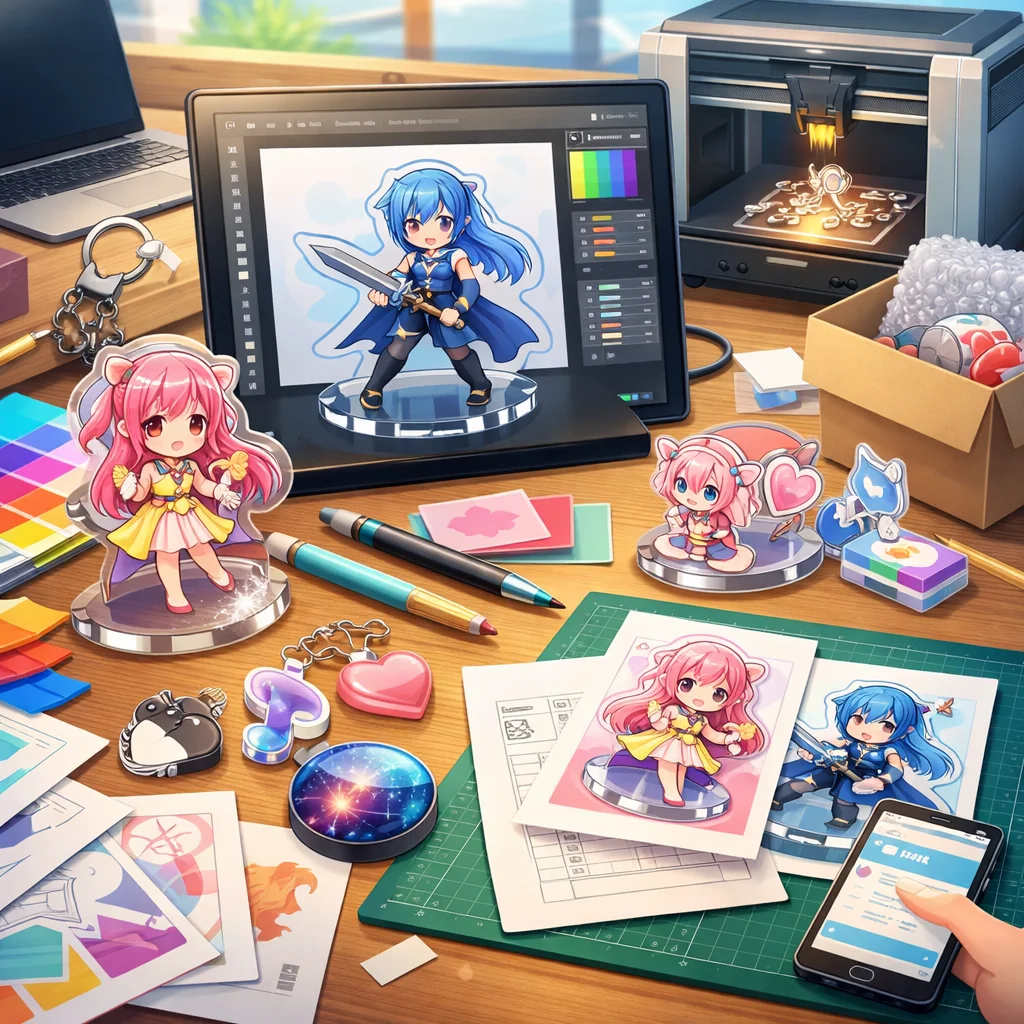 アクリルグッズのデザインから、入稿サポート、試作、発注に至る各ステップでの工夫が成功を導く。特に、アクリルの特性を活かし、入稿サポートを利用することで、高品質な商品を実現できる。