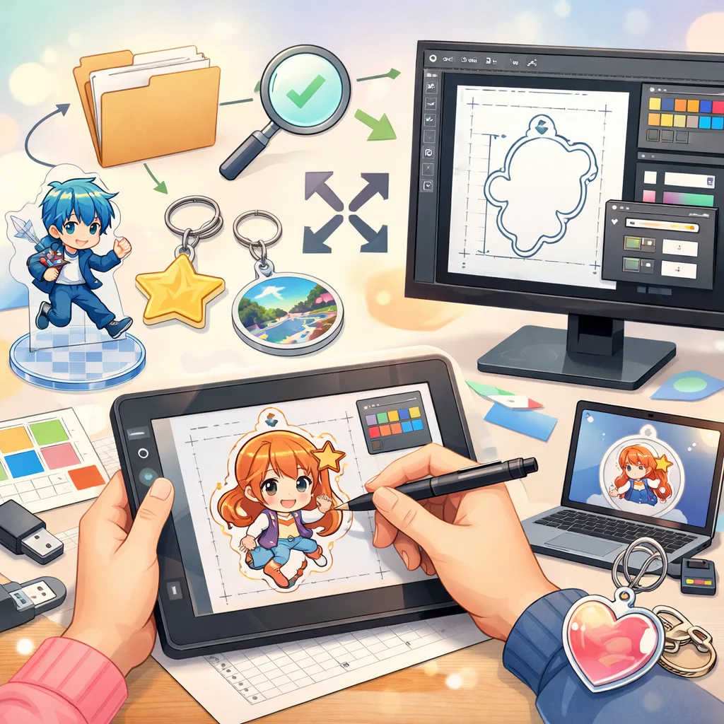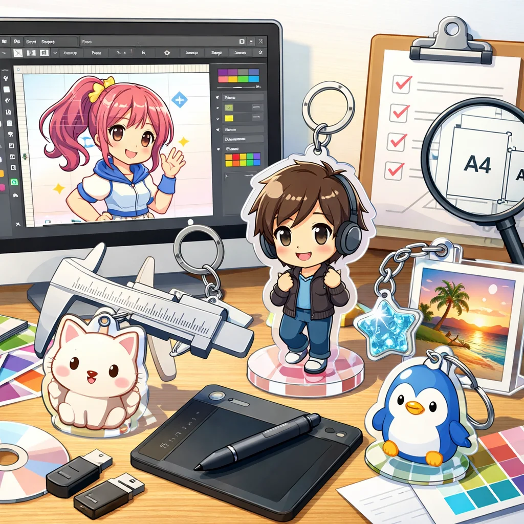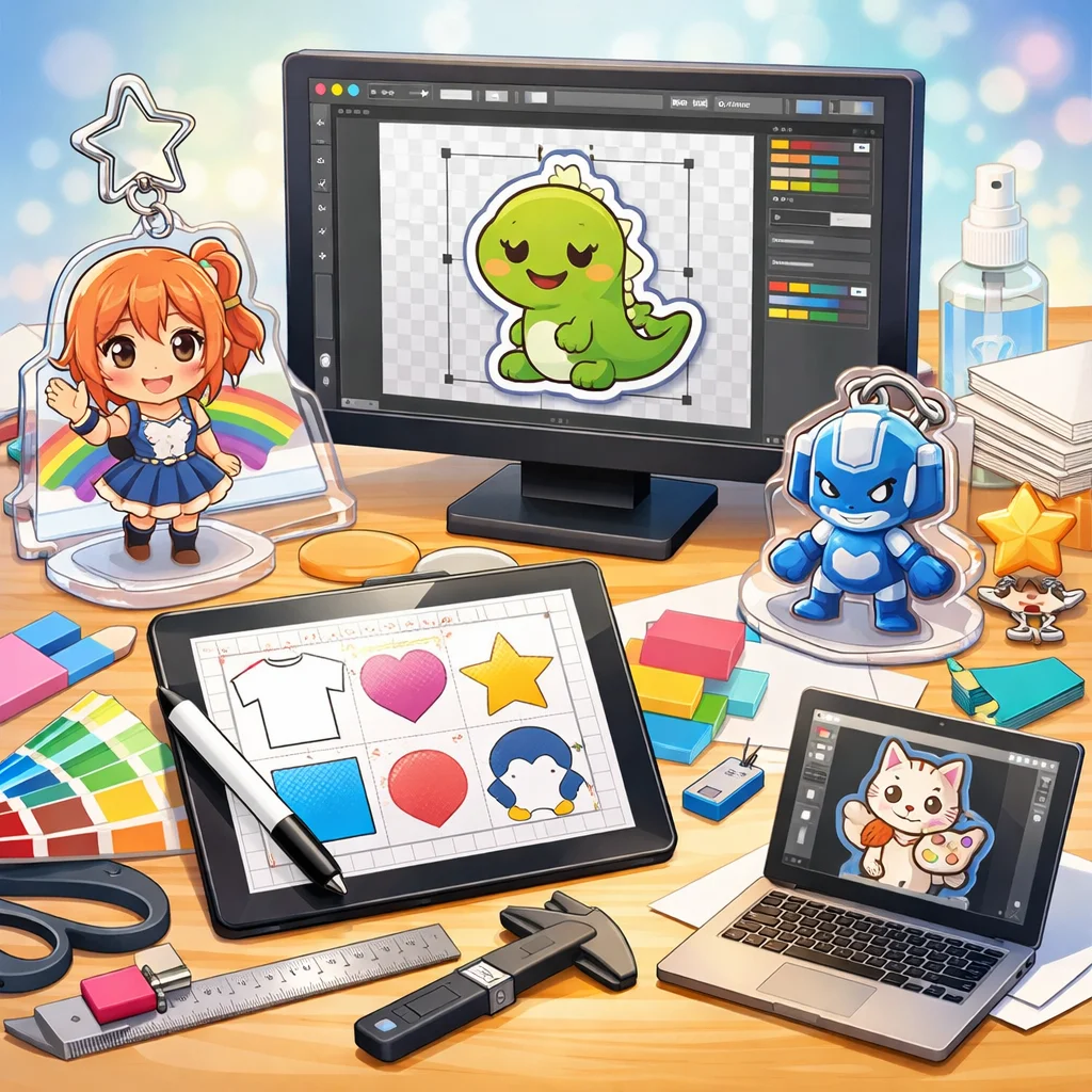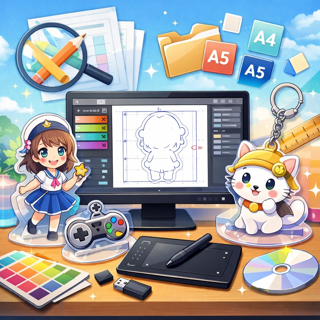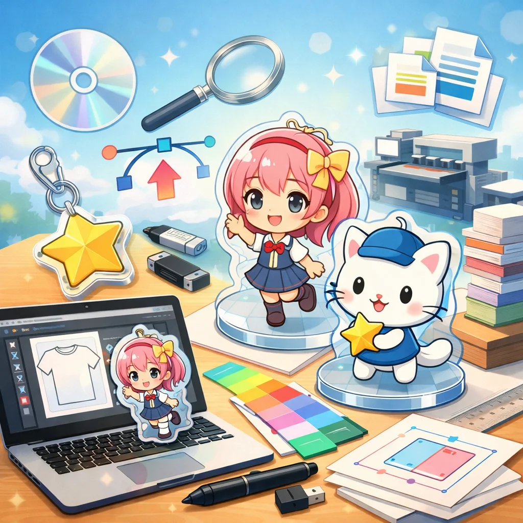 – 入稿データ作成のコツ:デザインの解像度は300dpi以上を推奨します。背景は透過PNG形式で保存し、線の太さや文字の大きさはアクリルグッズのサイズに合わせて調整してください。