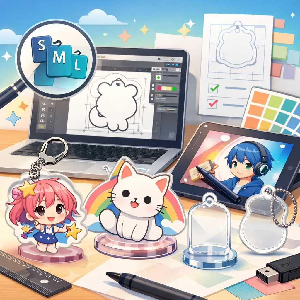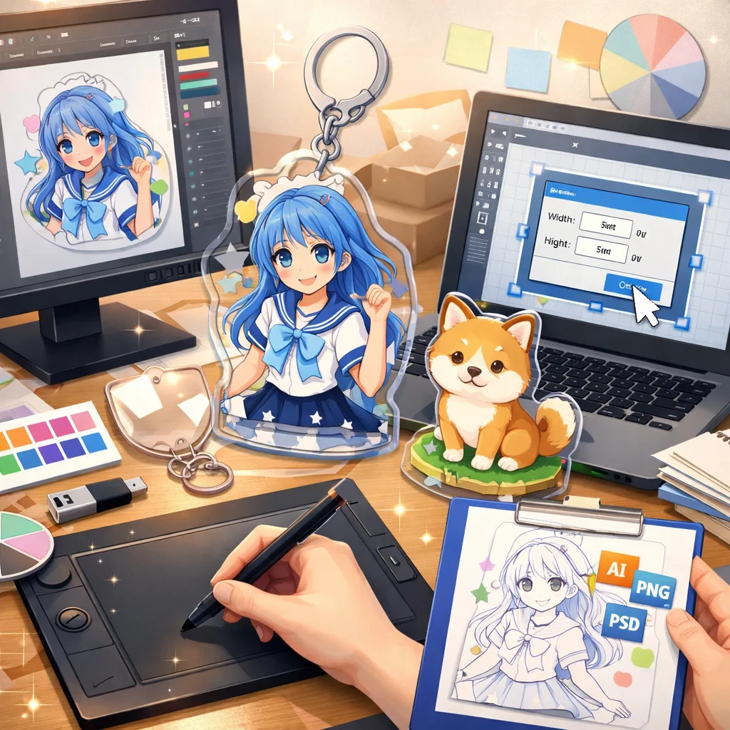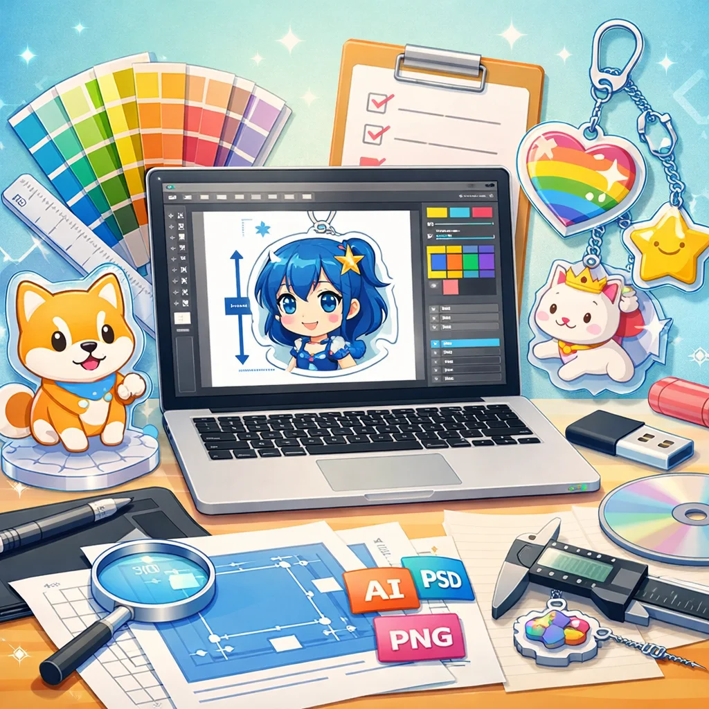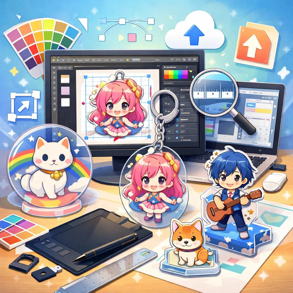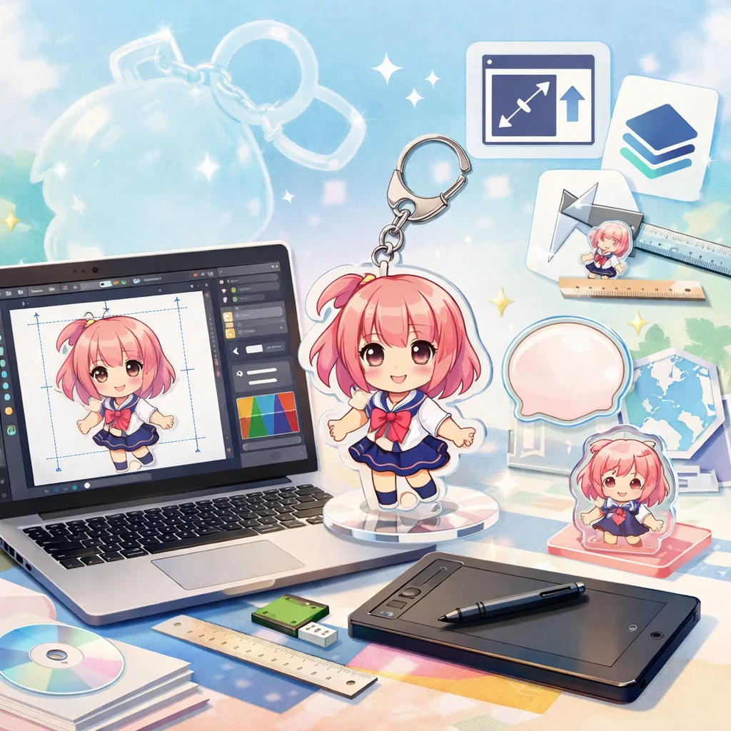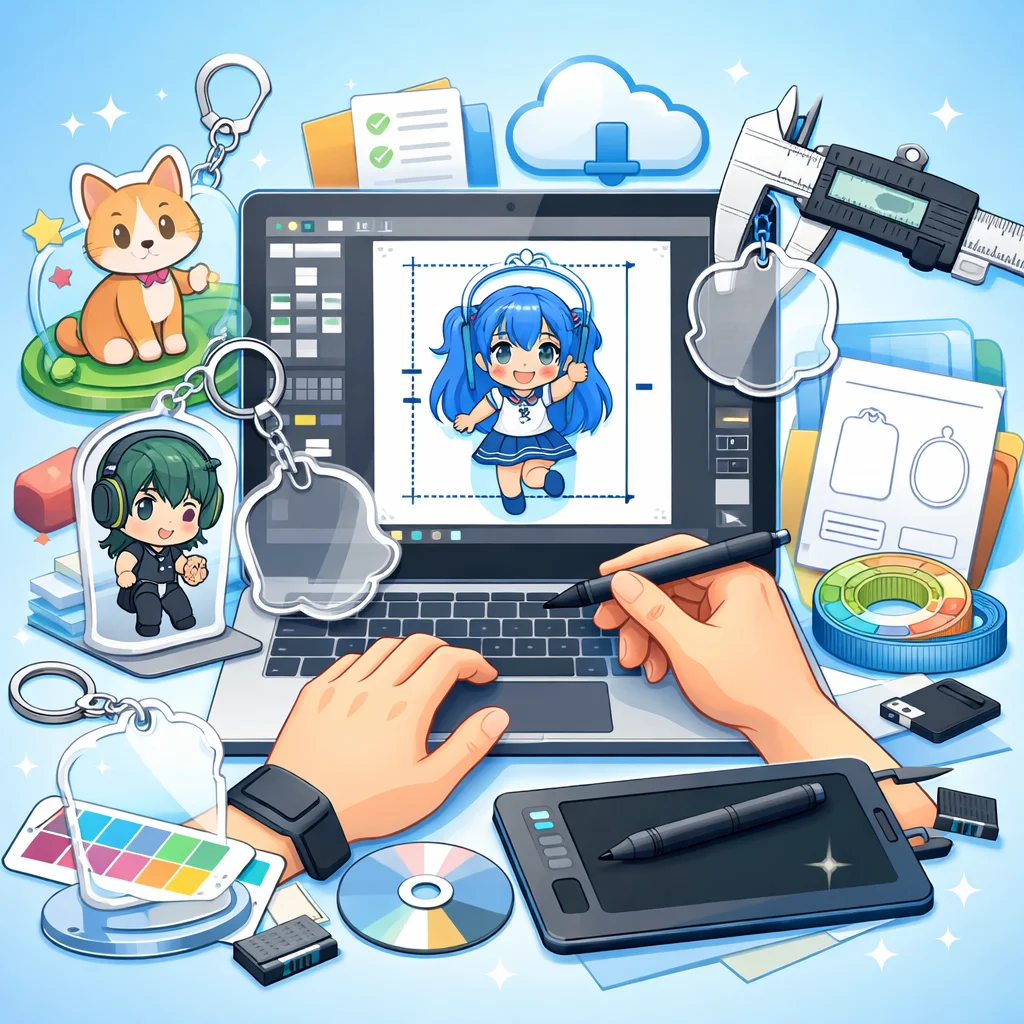 – 入稿データ作成のコツ:デザインの解像度は300dpi以上を推奨します。背景は透過PNG形式で保存し、線の太さや文字の大きさはアクリルグッズのサイズに合わせて調整してください。