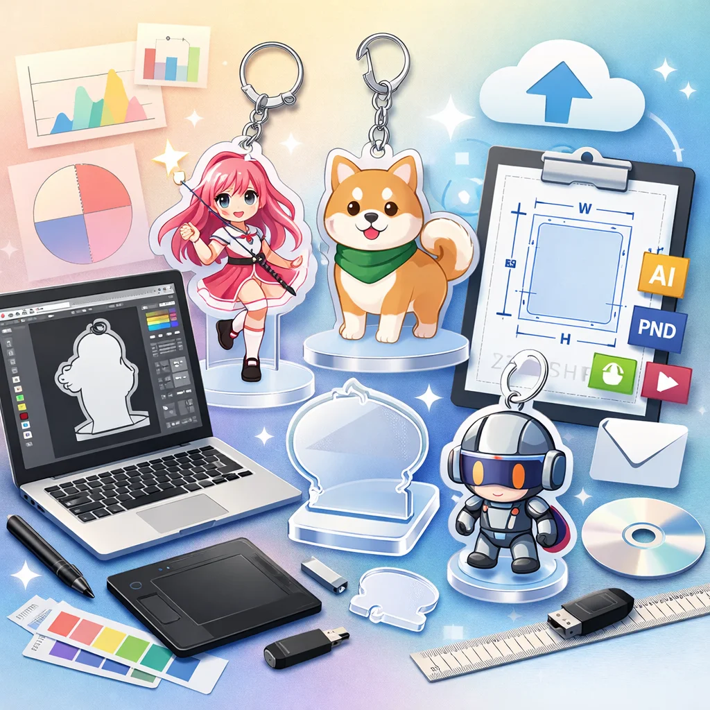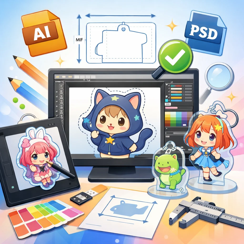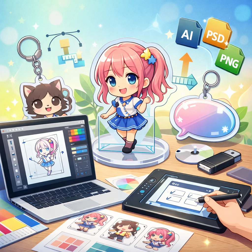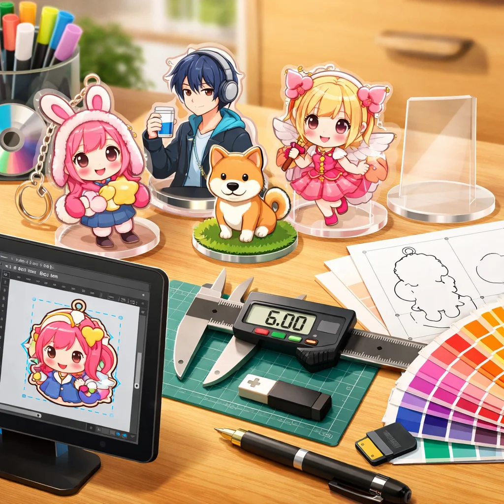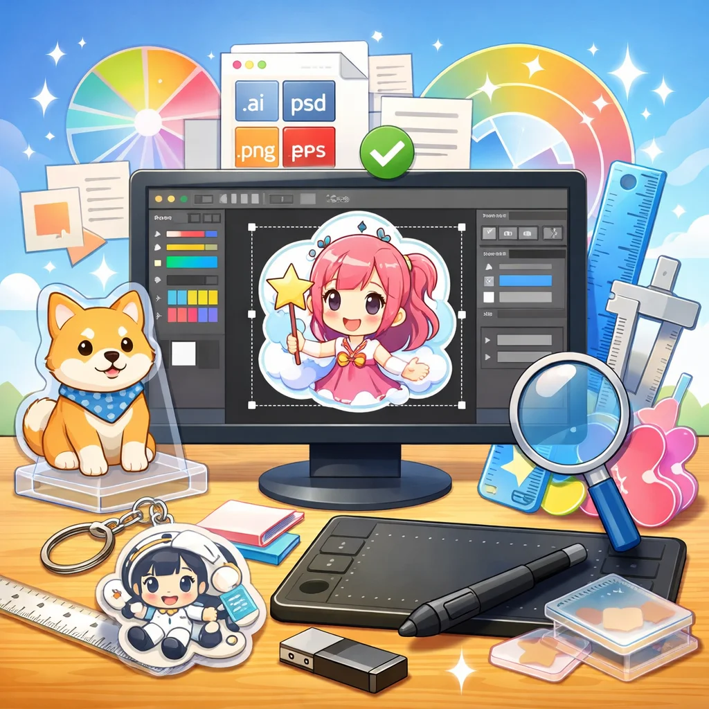 – 入稿データ作成のコツ:デザインの解像度は300dpi以上を推奨します。背景は透過PNG形式で保存し、線の太さや文字の大きさはアクリルグッズのサイズに合わせて調整してください。