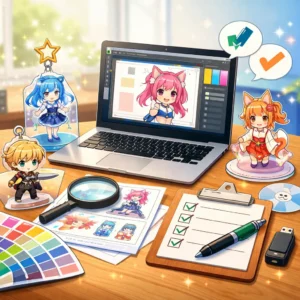 以上がアクリルグッズの入稿までの全体フローです。このように、各工程ごとに確認すべき要素を把握しておくことが、品質の高いアクリルグッズを完成させるためのポイントです。