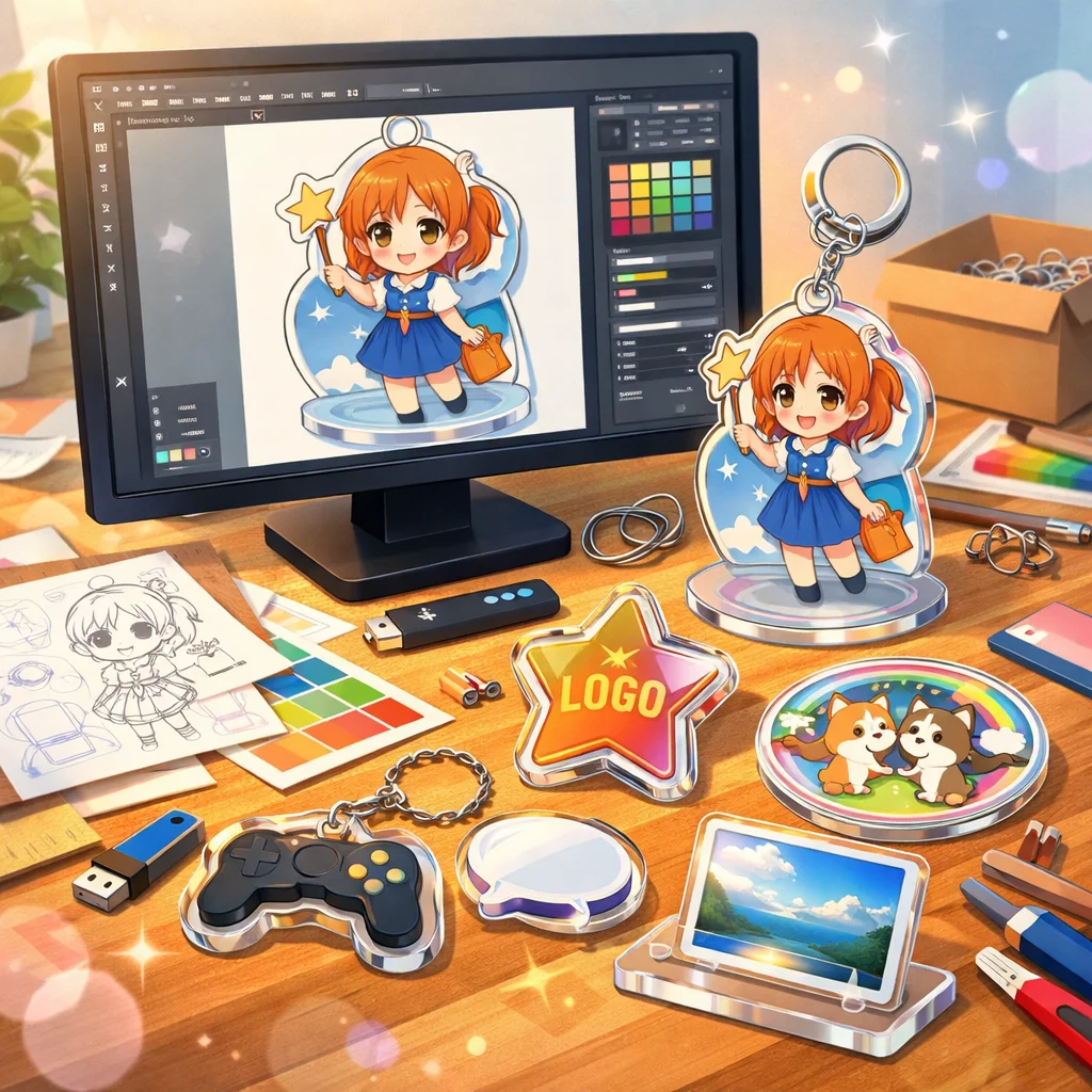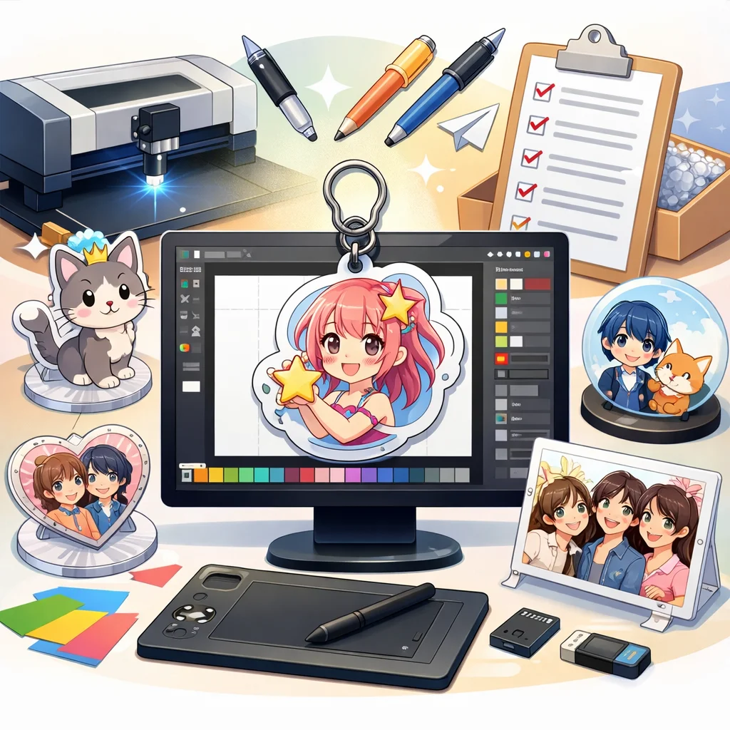 アクリルグッズのデザインを成功させるためには、デザイン素材の準備が欠かせません。権利確認や解像度、データ形式など、しっかりとした事前準備を行うことで、クオリティの高い仕上がりが期待できます。ぜひ、これらのポイントを参考にして、素敵なアクリルグッズ作成に挑戦してみてください。