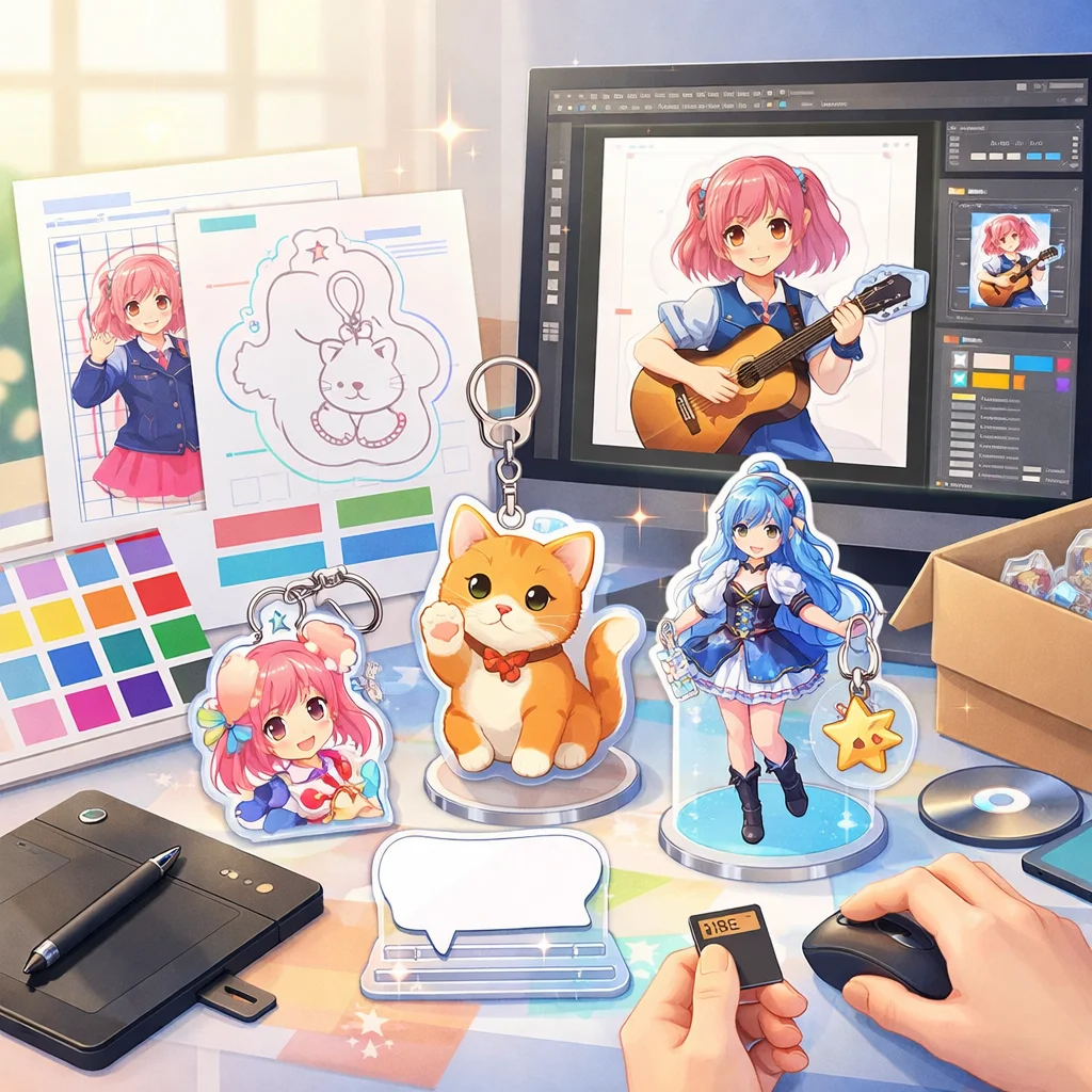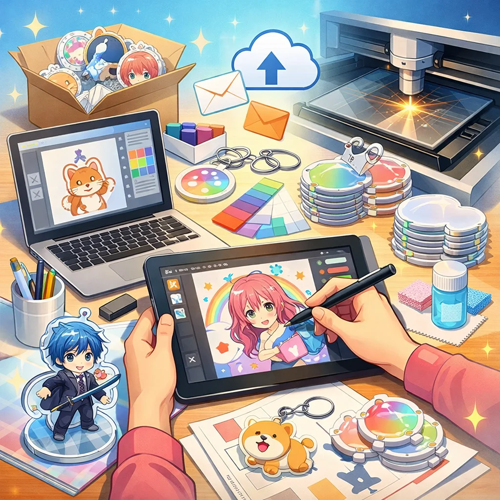 アクリルグッズのデザインを入稿する際、上記の手順とコツを実践することで、品質の高い製品を手に入れることができます。データ制作だけでなく、業者とのコミュニケーションも重要な要素となるため、注意深く進めることが成功への近道です。