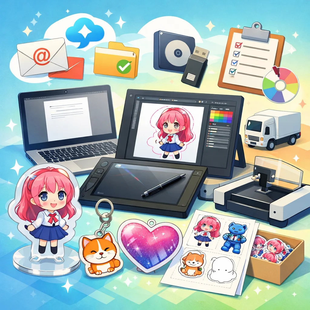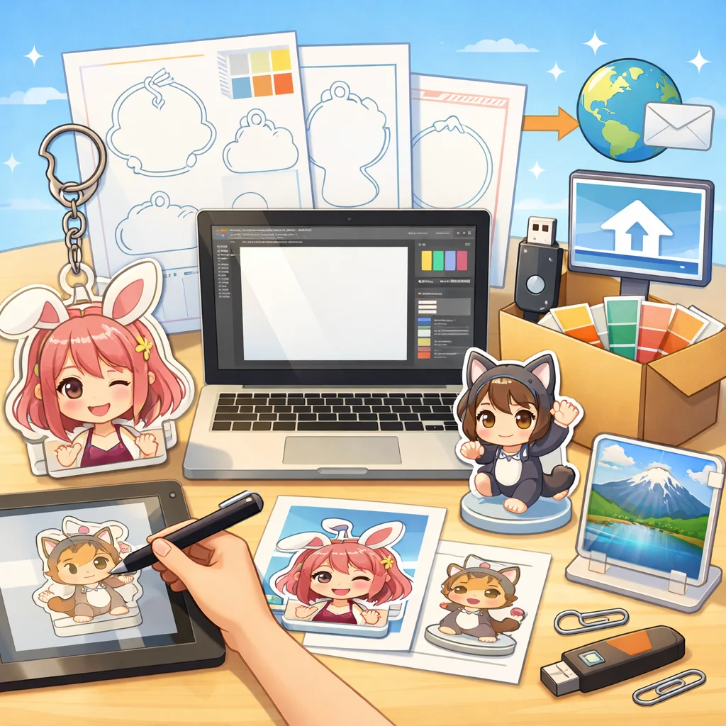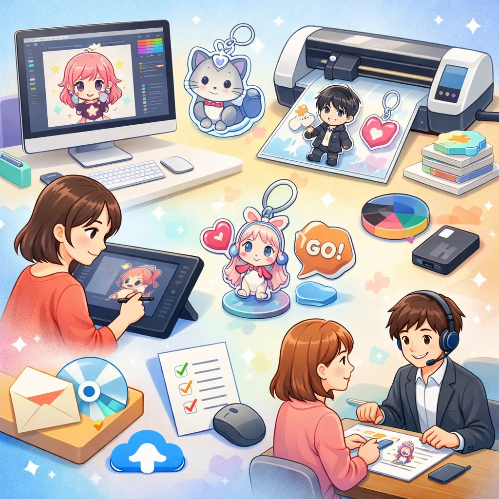 アクリルグッズのデザイン入稿サポートは、初めてアクリルグッズを作成する個人や同人、そして小規模事業者の方々にとって、非常に重要なサービスです。このサポートを活用することで、デザインデータの不備や印刷会社とのやり取りに関する不安を解消し、入稿から製品完成までの手順をスムーズに進めることができます。