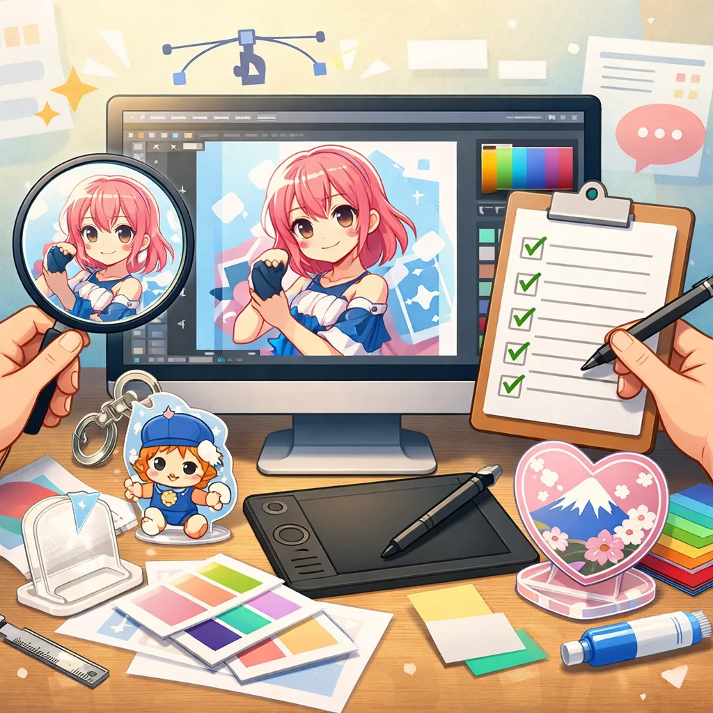 アクリルグッズ製作時には、入稿サポート校正時にのチェックが重要です。デザイン時の失敗例(カットミスや白版不足など)を理解し、確認ポイントを押さえて、品質の高い製品を目指しましょう。