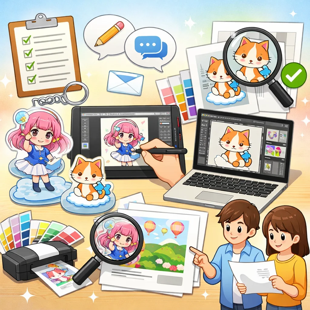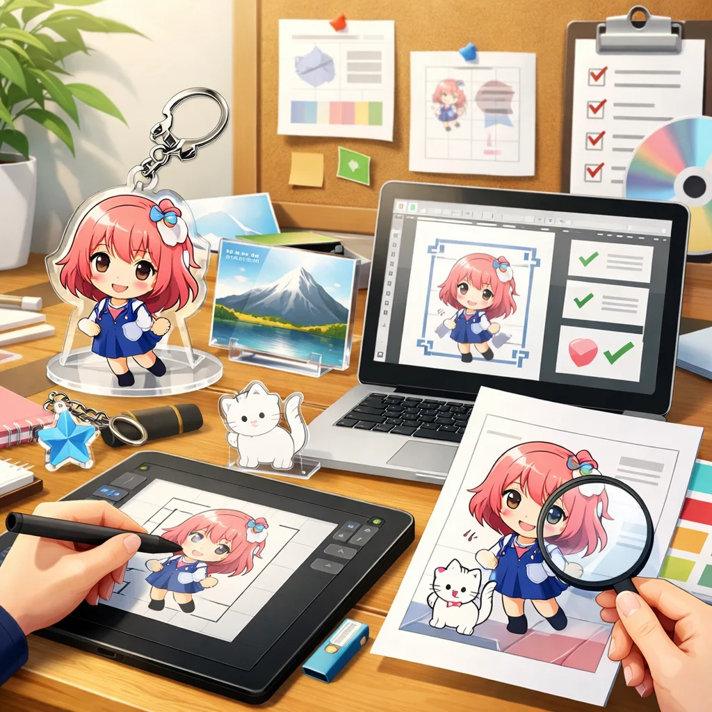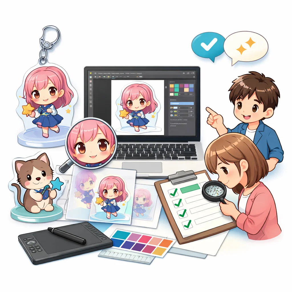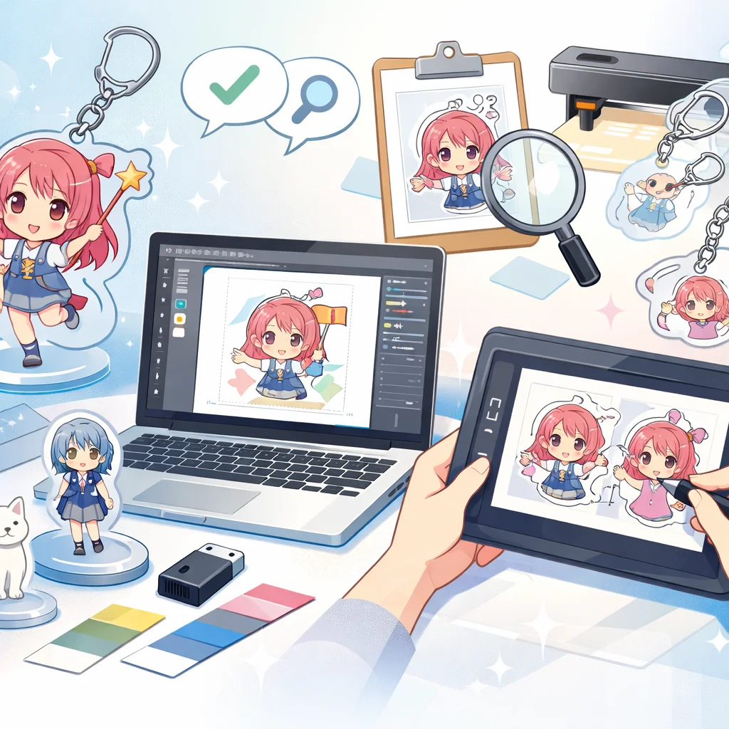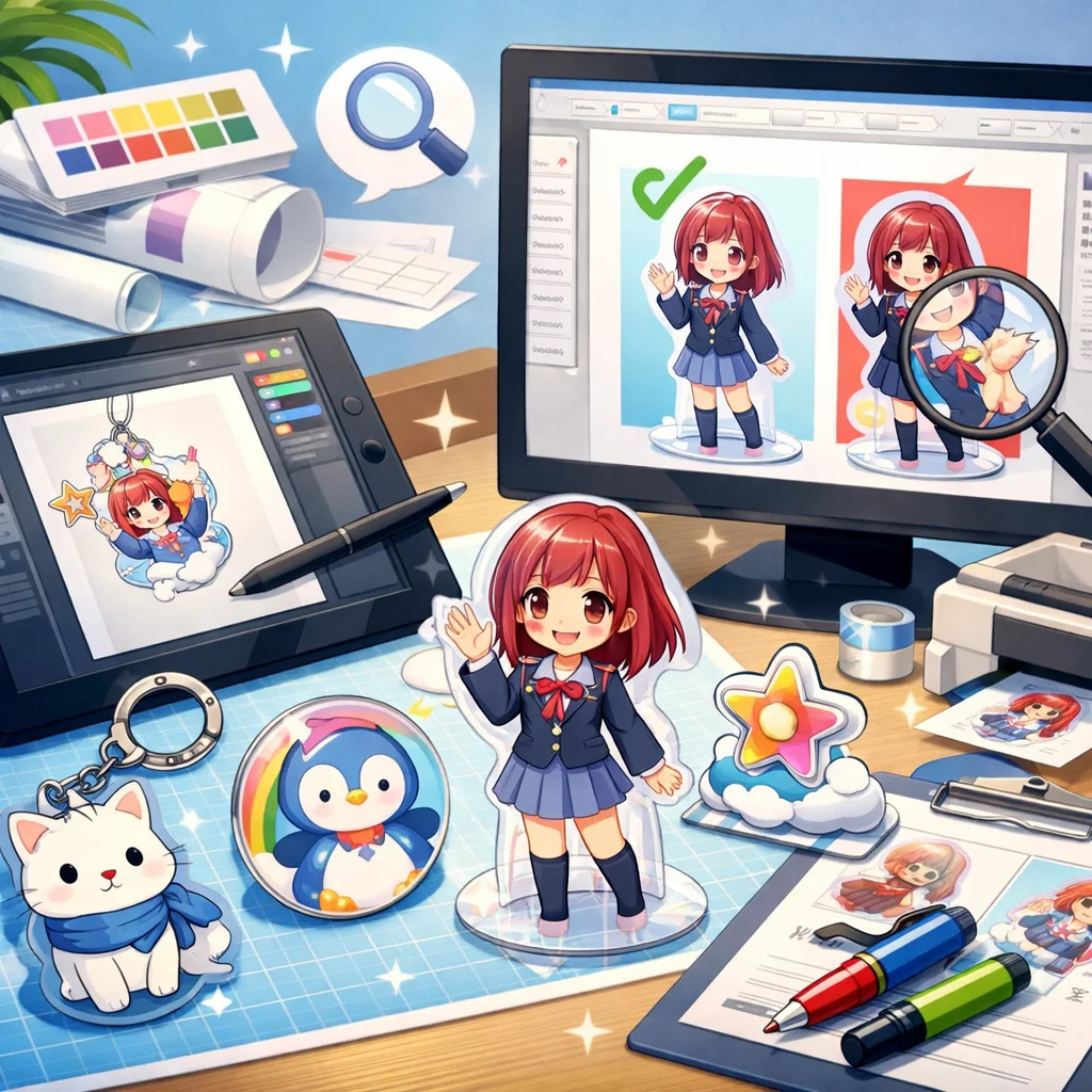 アクリルグッズの制作において、校正は最終確認の工程であり、デザインデータの正確性を保証します。データチェック、出力確認、修正を経て本生産に進むことが重要です。