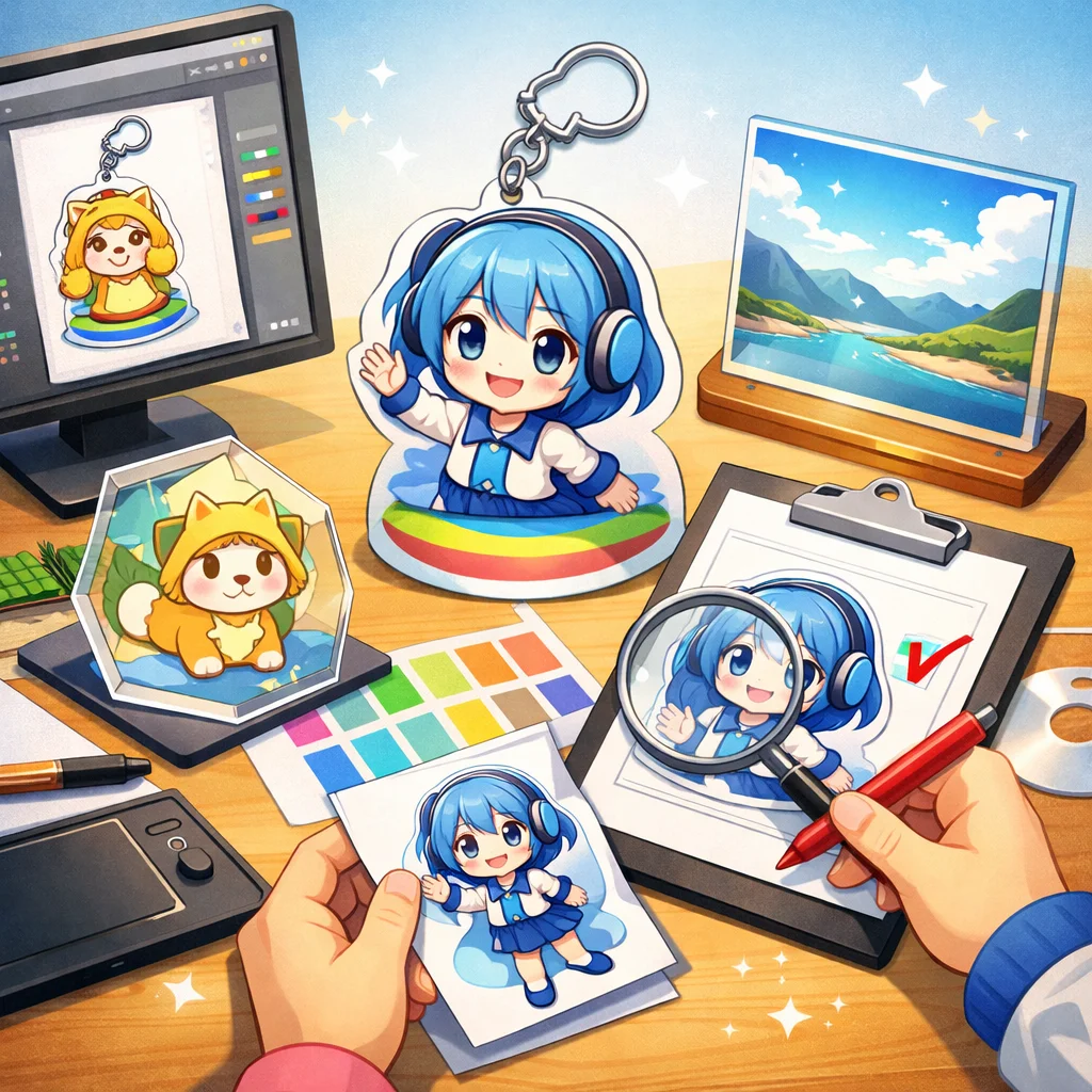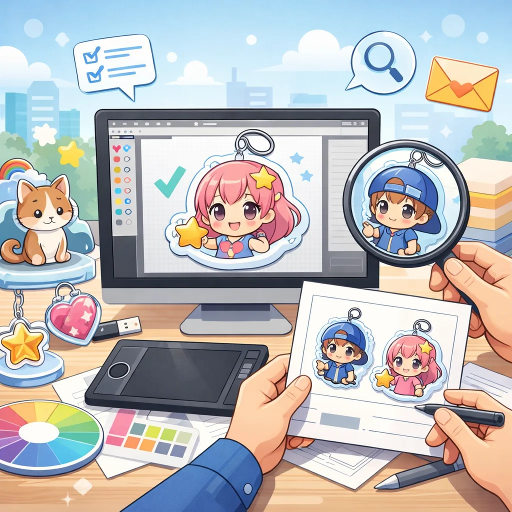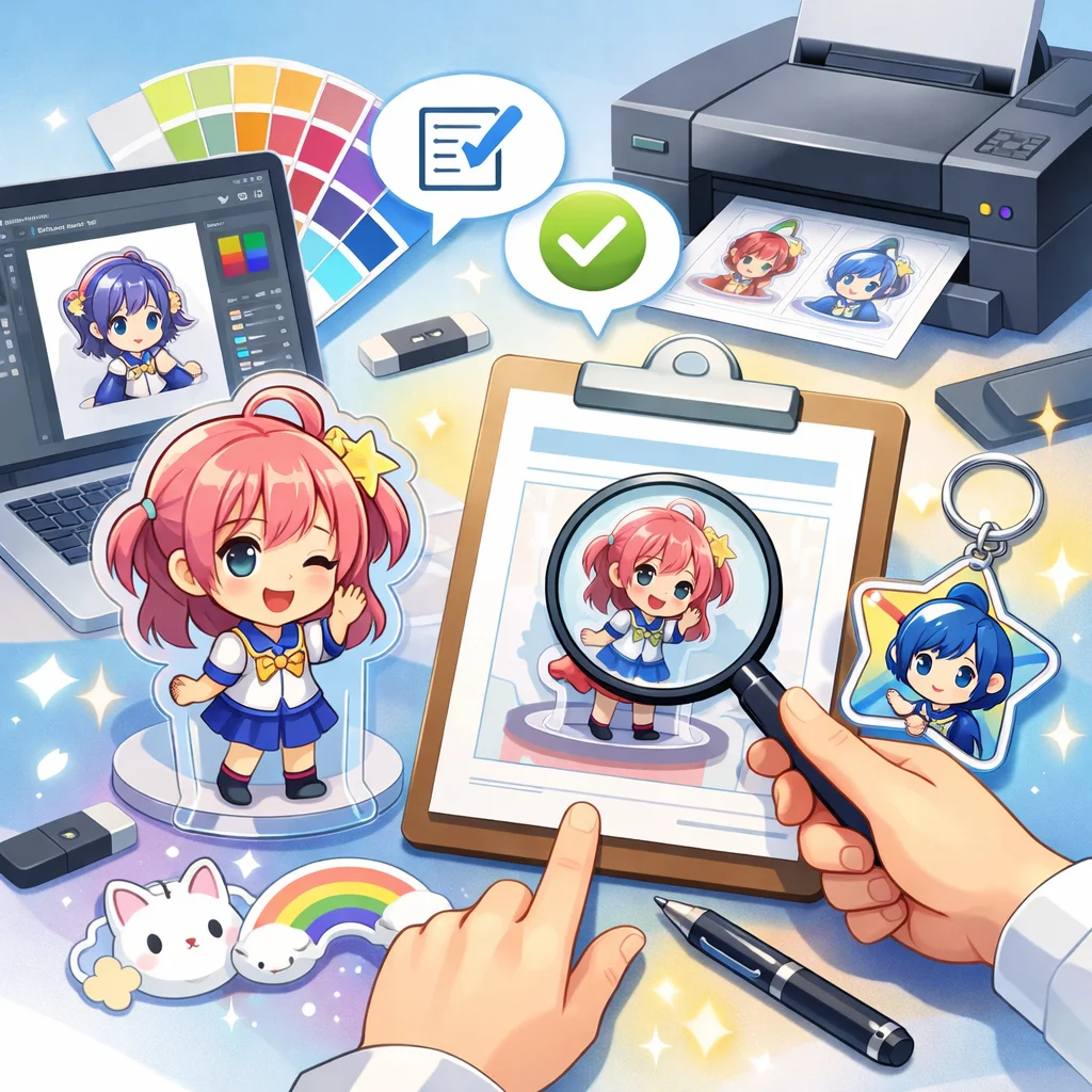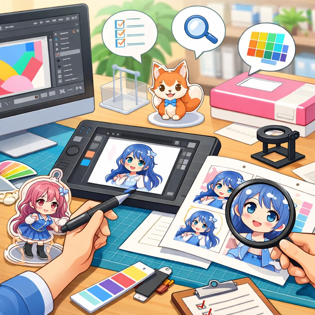 アクリルグッズの制作において、校正は最終確認の工程であり、デザインデータの正確性を保証します。データチェック、出力確認、修正を経て本生産に進むことが重要です。