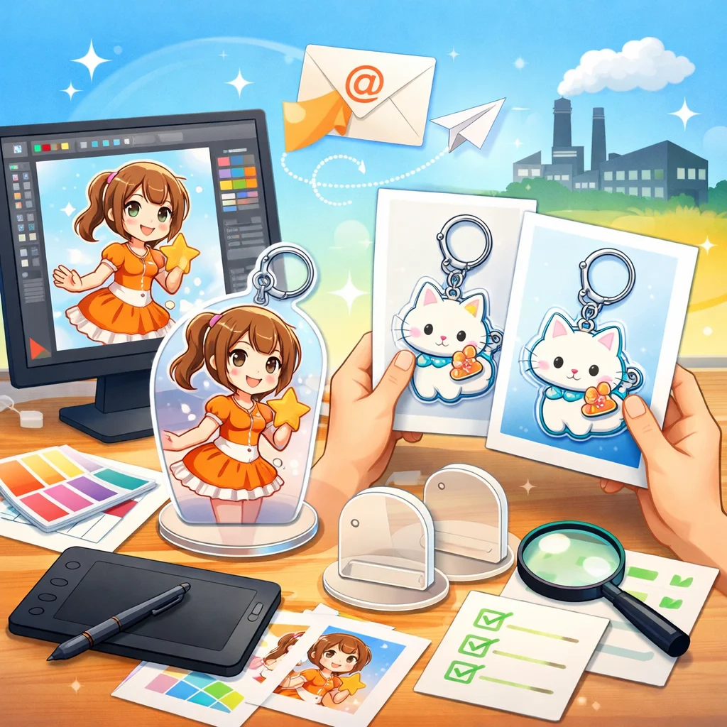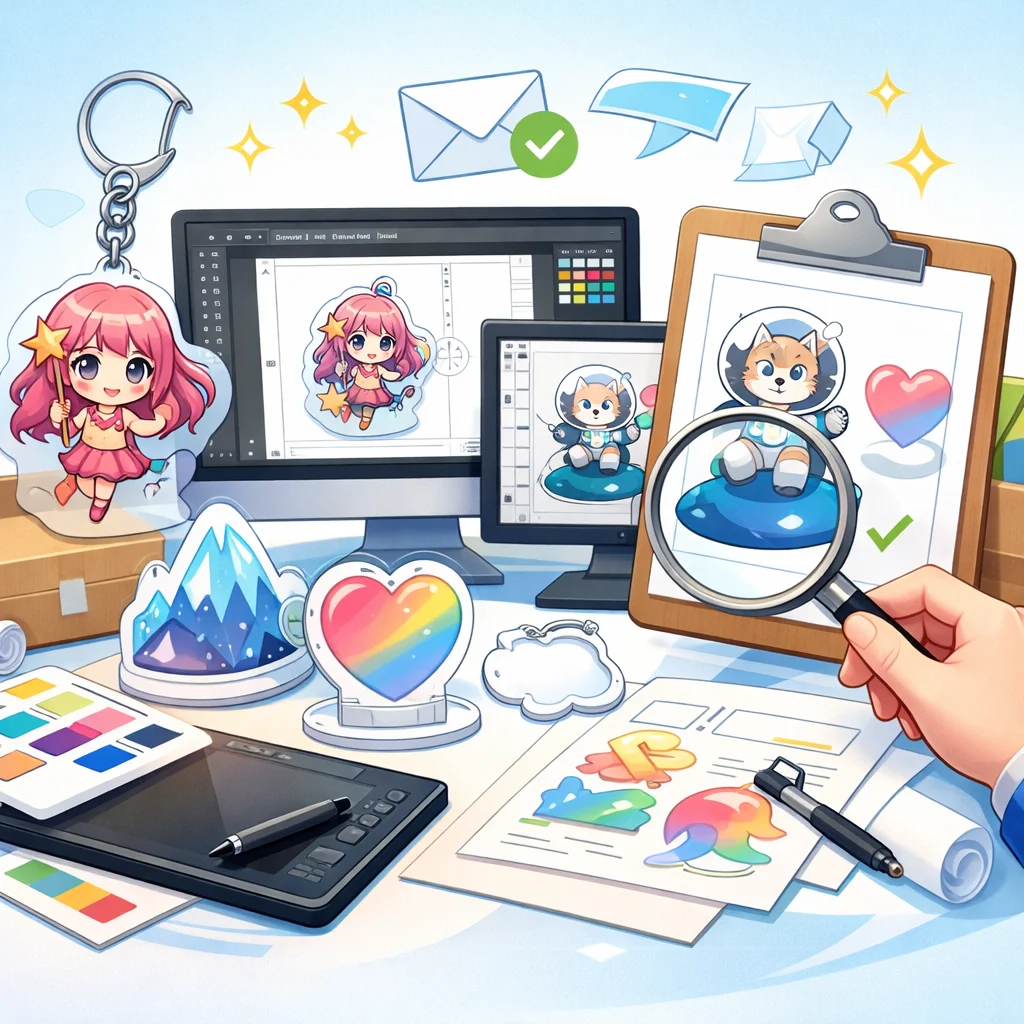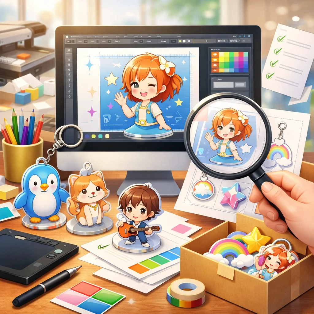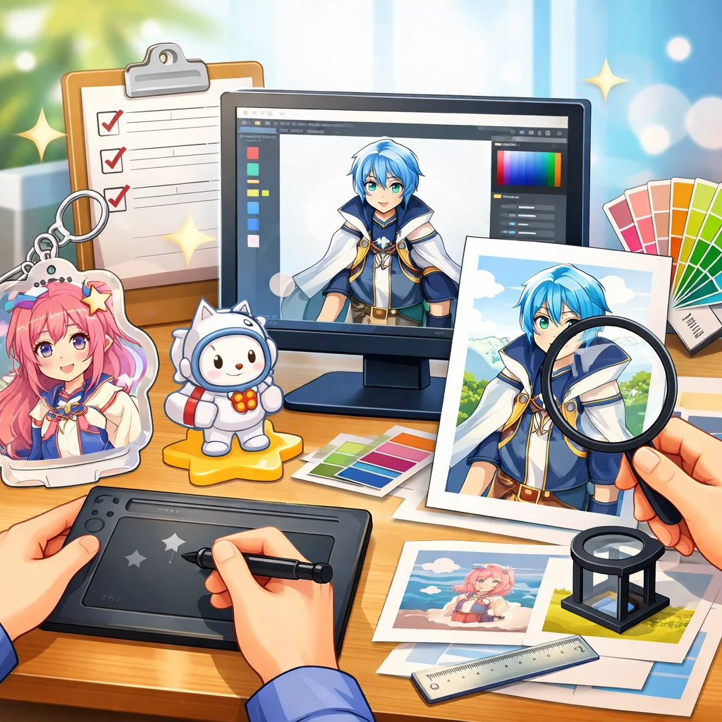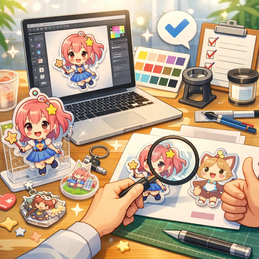 アクリルグッズの制作において、校正は最終確認の工程であり、デザインデータの正確性を保証します。データチェック、出力確認、修正を経て本生産に進むことが重要です。
