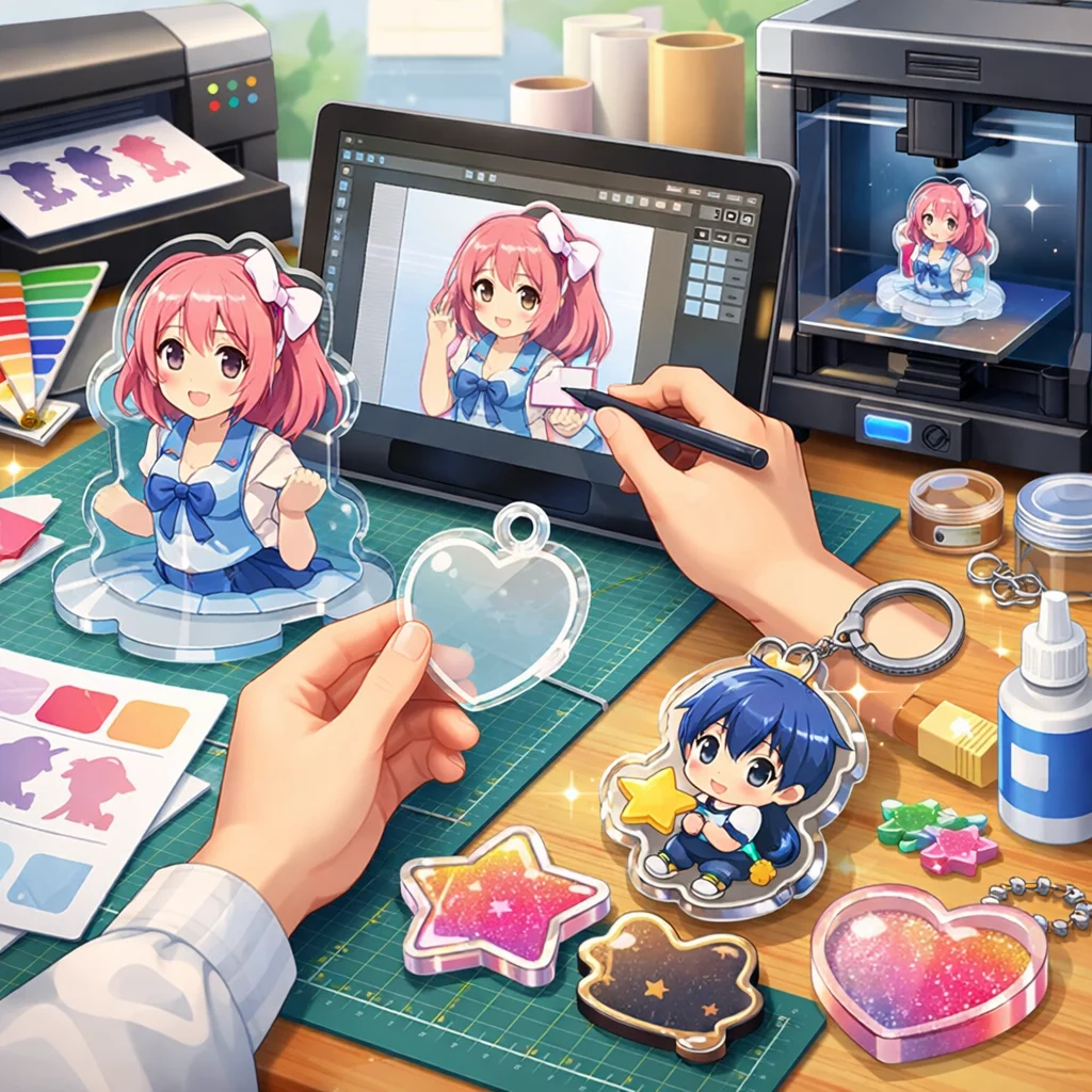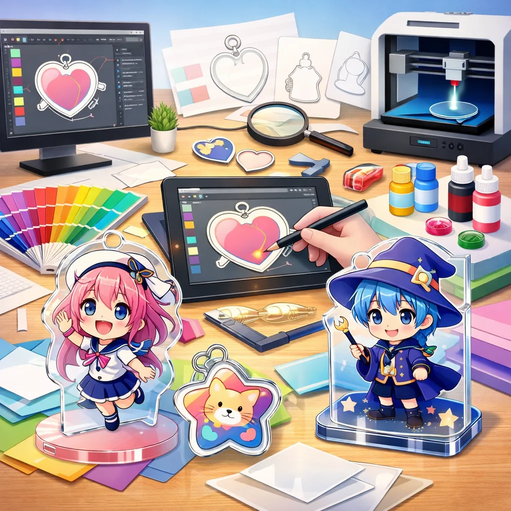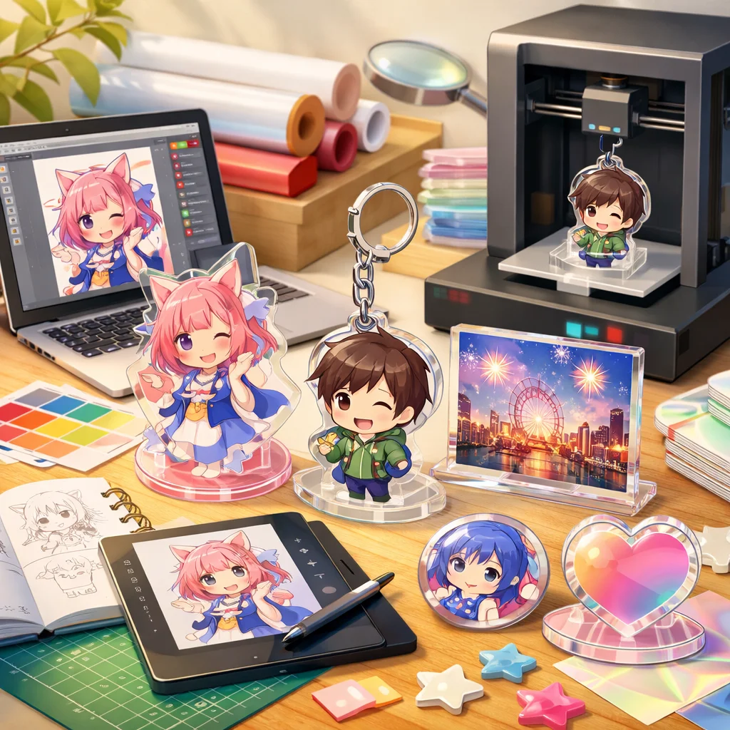 アクリルグッズの作成は、種類選定からデザイン設計、入稿、試作、そして量産へと進む一連のプロセスで構成されています。本記事では、特に前半の「種類選定」と「デザイン設計」に焦点を当て、各段階での注意点や品質向上のポイントを解説します。