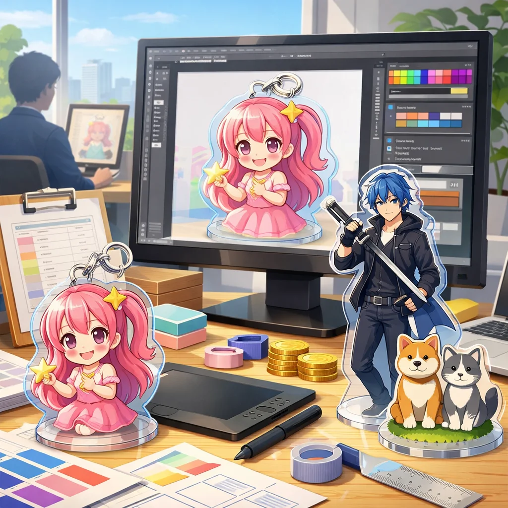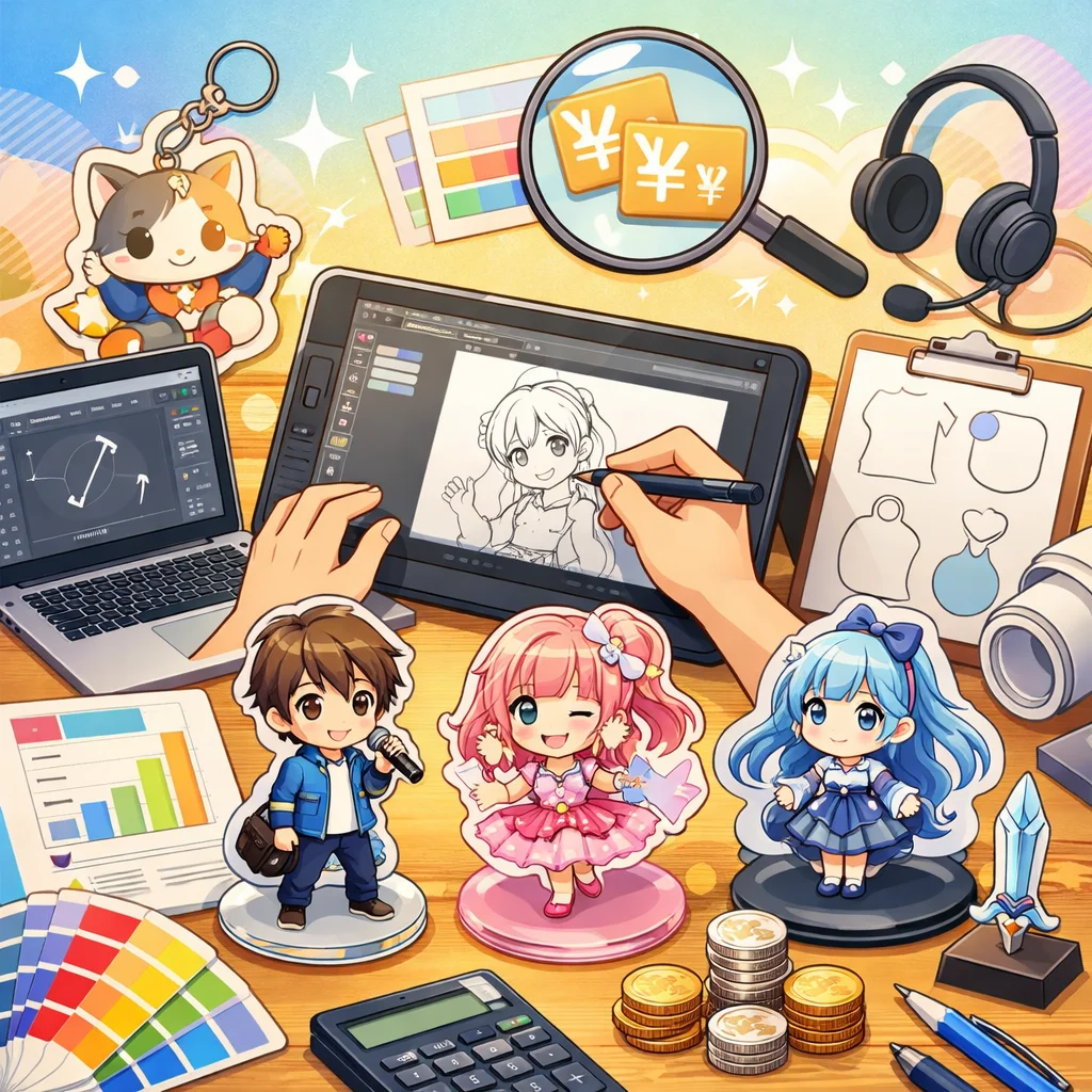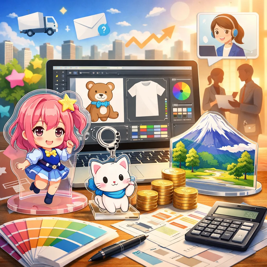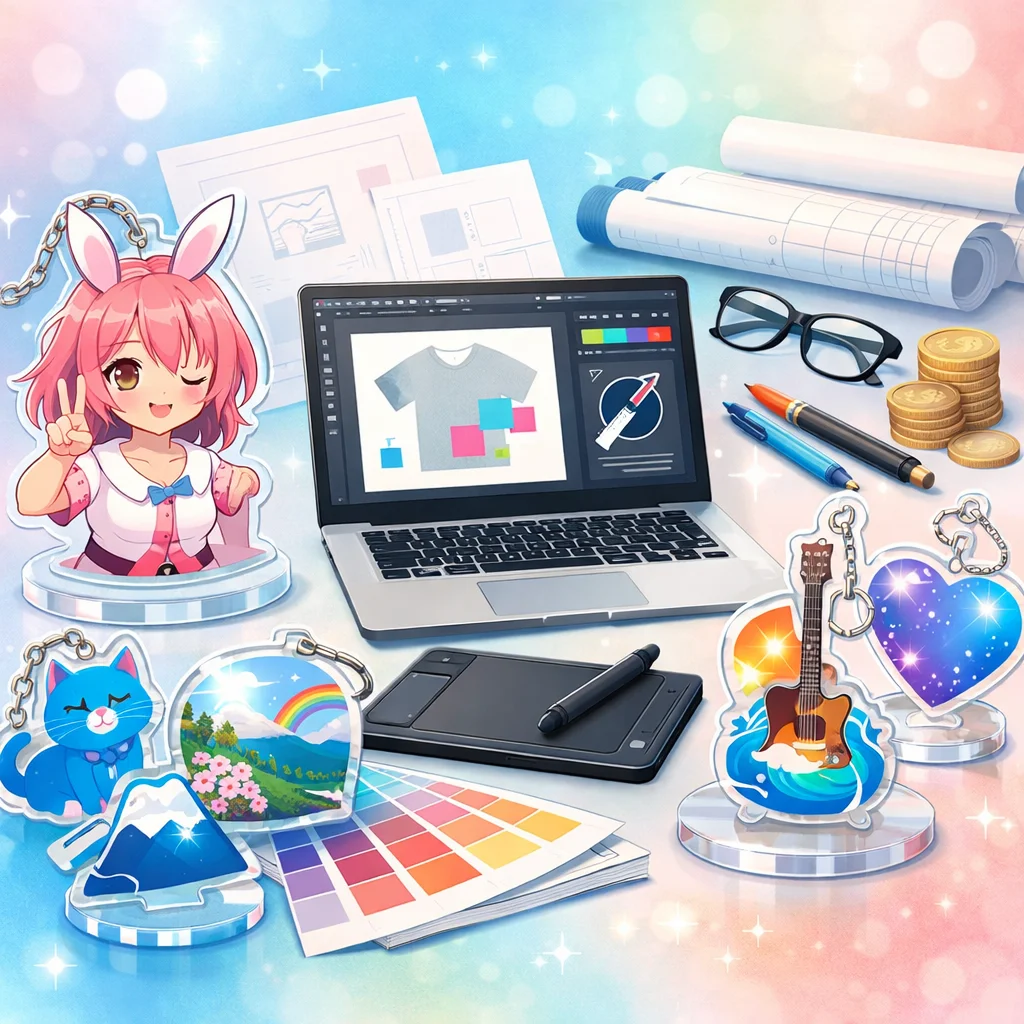 「デザイン代行」はアクリルグッズの売上やブランド印象に大きく影響します。見た目の統一感、印刷適性、SNS映え、工数削減などの利点がある一方で、コストがかかる場合もあります。自作か代行かの選択は、ニーズに応じて慎重に行うことが大切です。