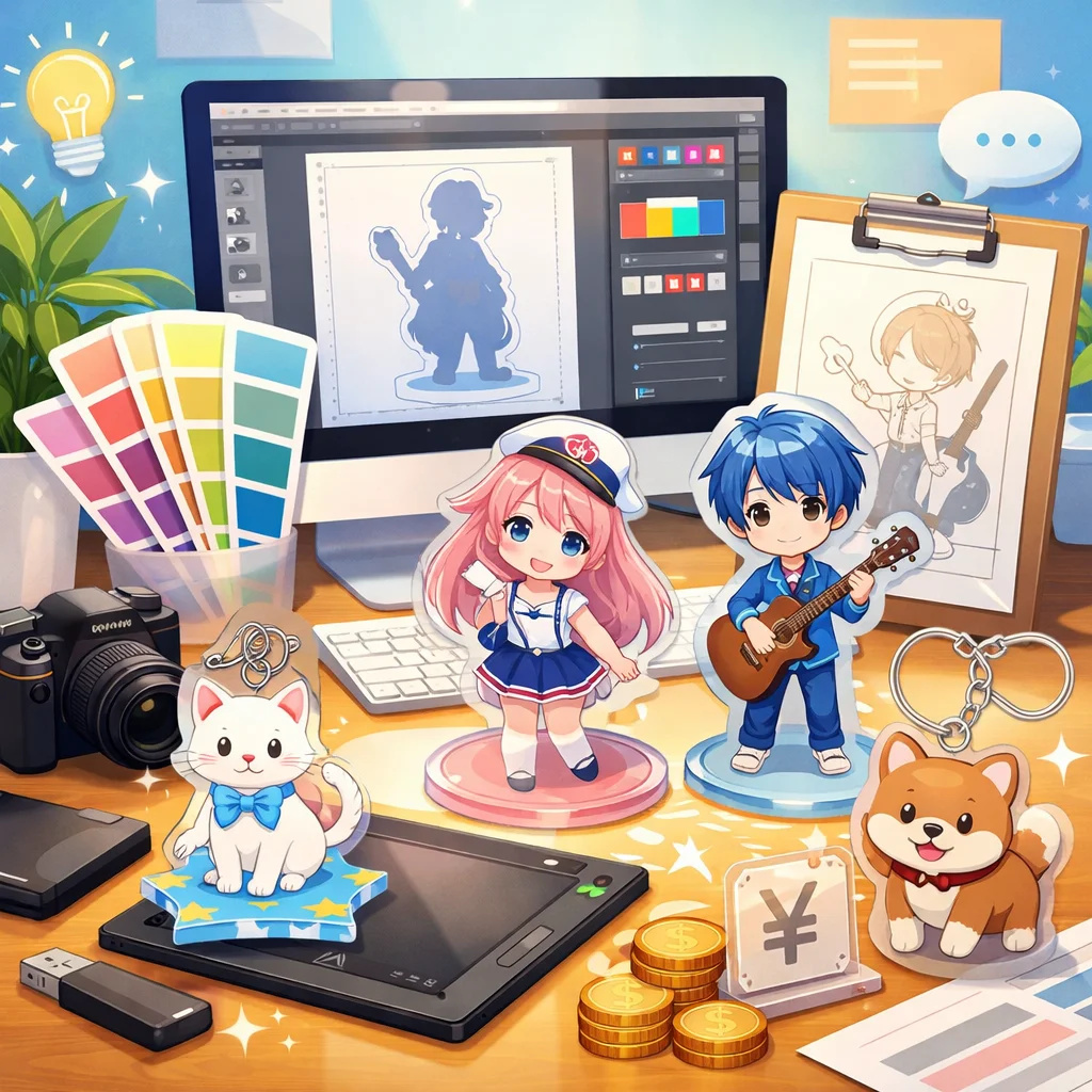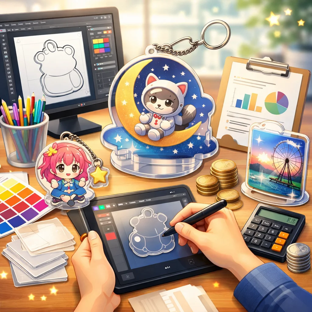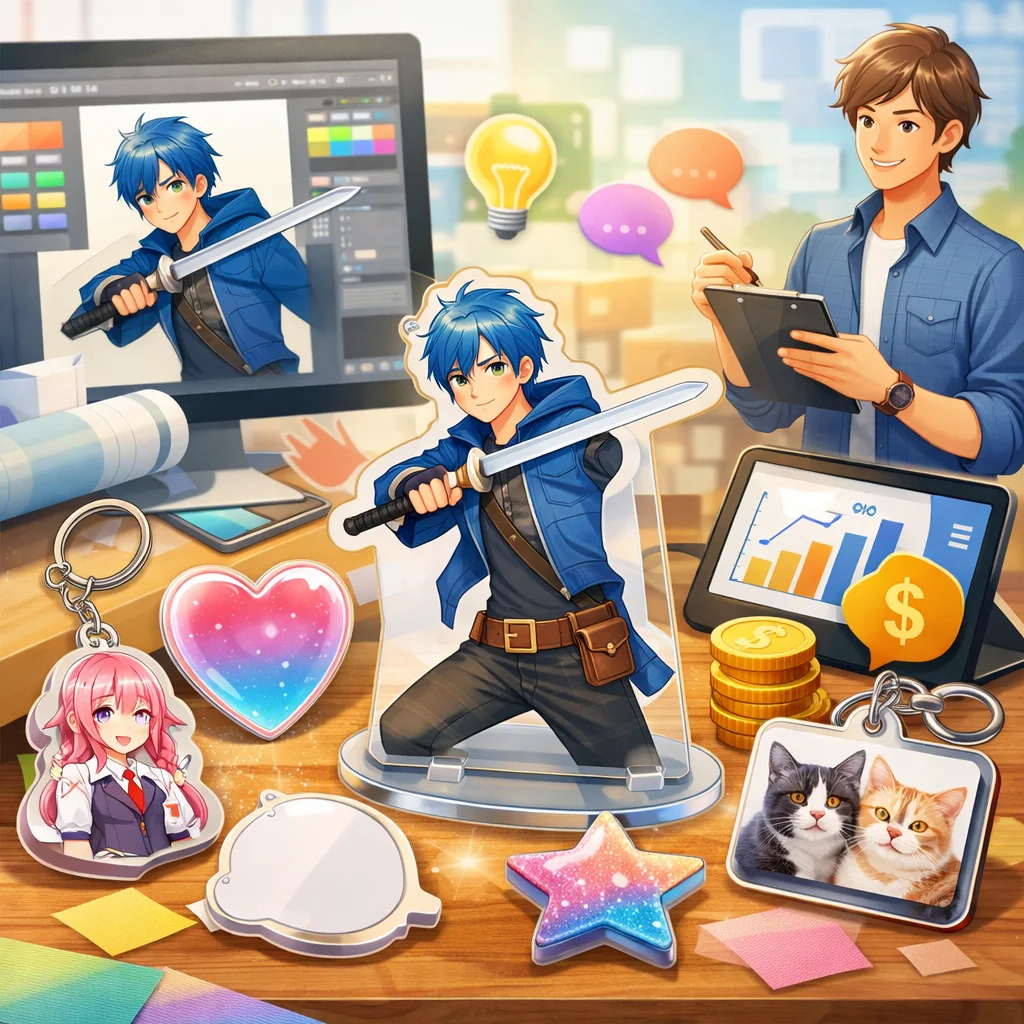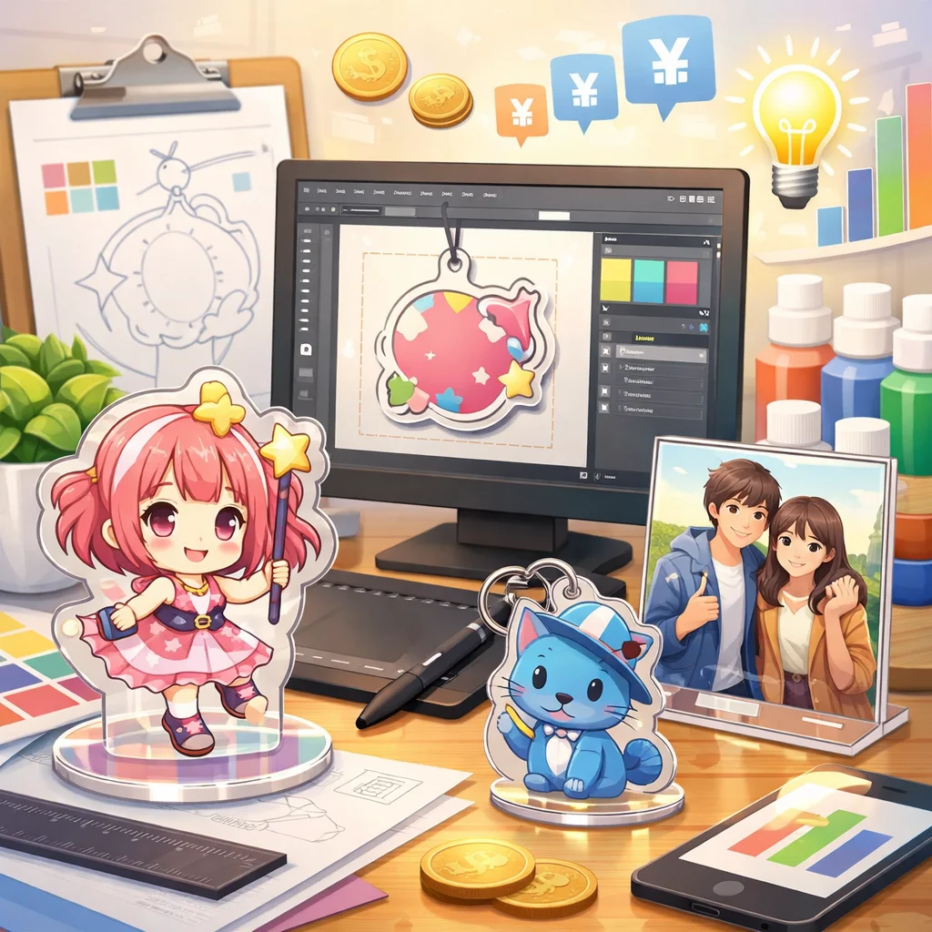 「デザイン代行」はアクリルグッズの売上やブランド印象に大きく影響します。見た目の統一感、印刷適性、SNS映え、工数削減などの利点がある一方で、コストがかかる場合もあります。自作か代行かの選択は、ニーズに応じて慎重に行うことが大切です。