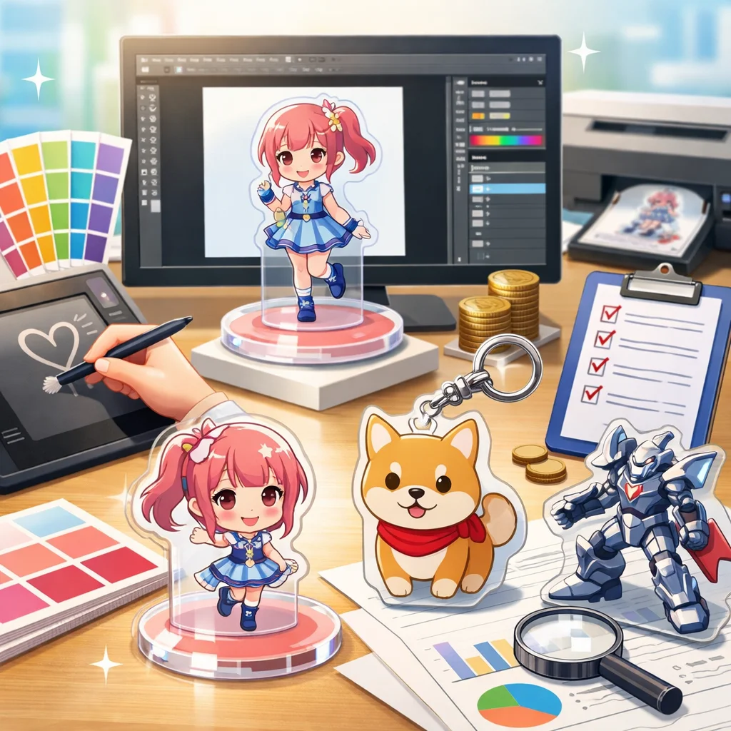 独自のアクリルグッズデザインは、形状、レイヤー、透明部、ギミック、情報設計、シリーズ展開、パッケージなどの工夫で他と差別化されます。