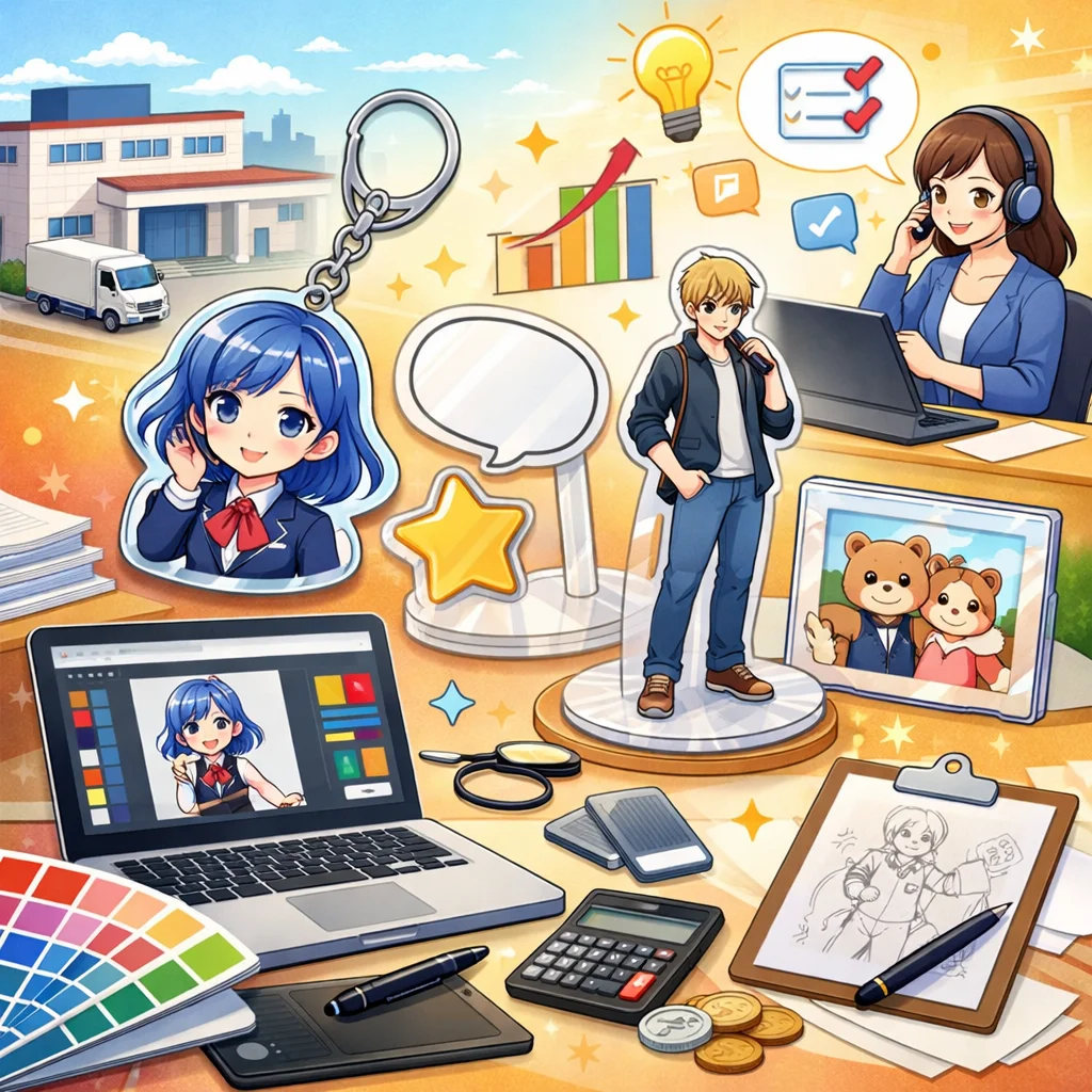 「アクリルグッズにおけるデザイン入稿サポートは、ミスを減らし、納期、コスト、品質を向上させるための重要なツールです。」