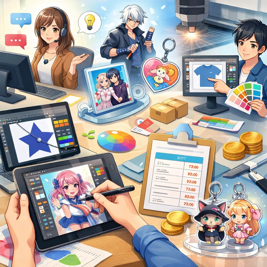 アクリルグッズの製作において、デザイン代行入稿サポートは重要な役割を果たします。これらのサービスの違いと、依頼前に決めるべき事項について詳しく解説します。