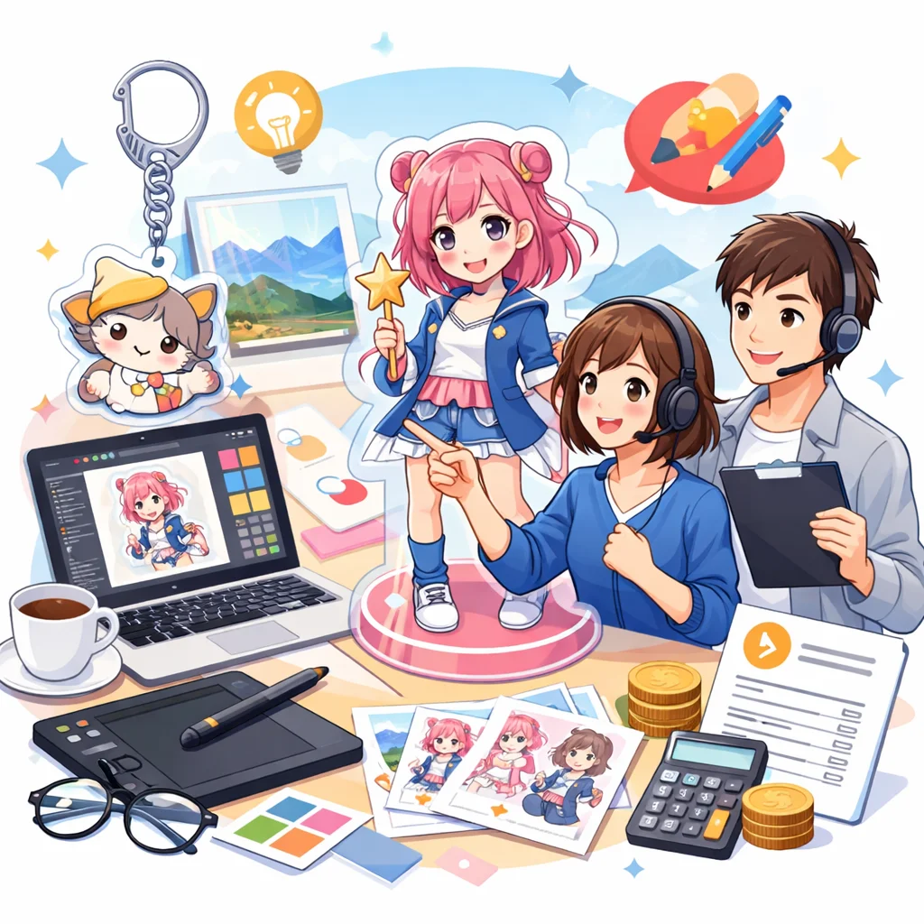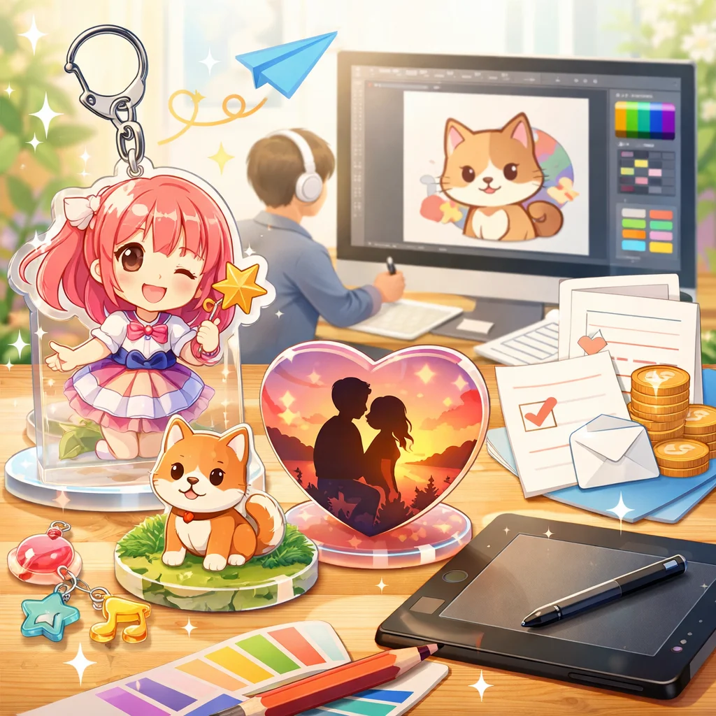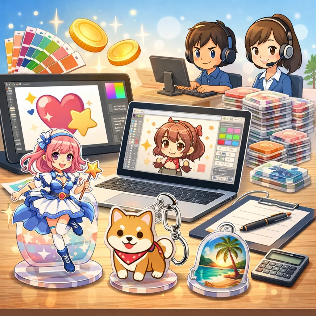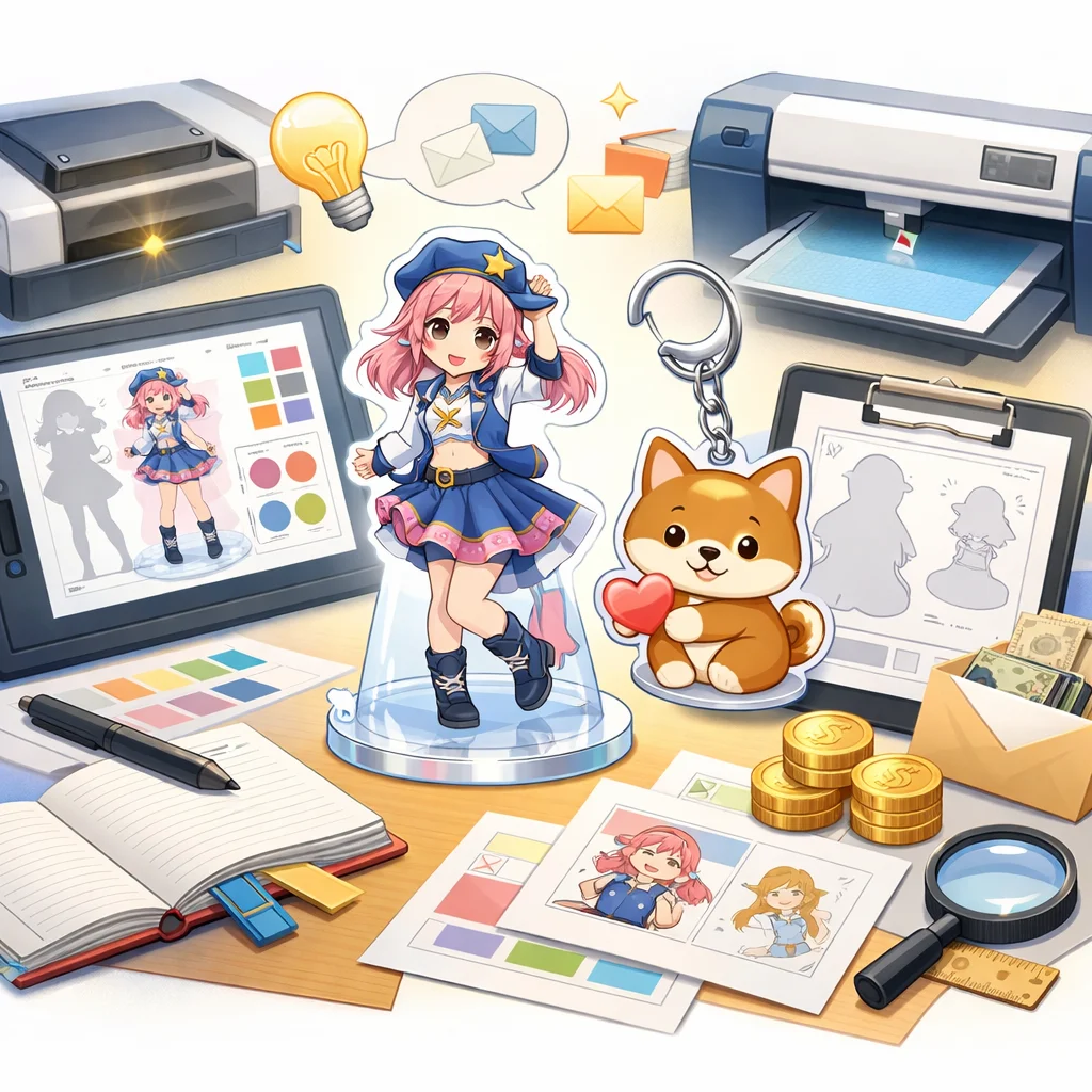 アクリルグッズ製作において、サポートを受けることは単なる助けではなく、効率的かつ質の高い成果を実現するための重要な戦略です。「デザイン」や「入稿サポート」、「デザイン代行」、そして「料金」をしっかりと理解し、活用することで、理想のアクリルグッズが手に入るでしょう。