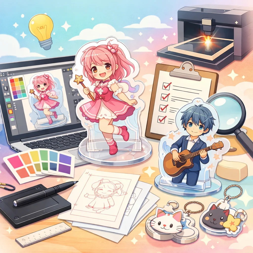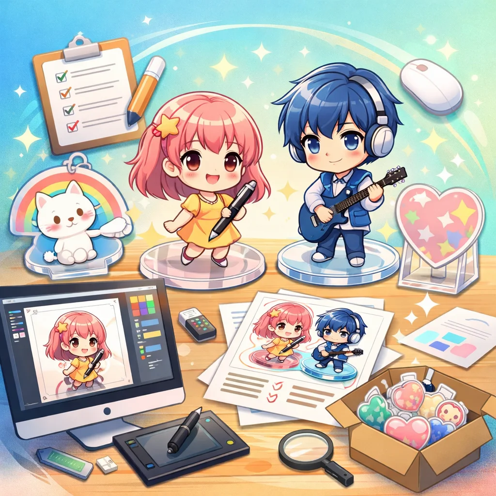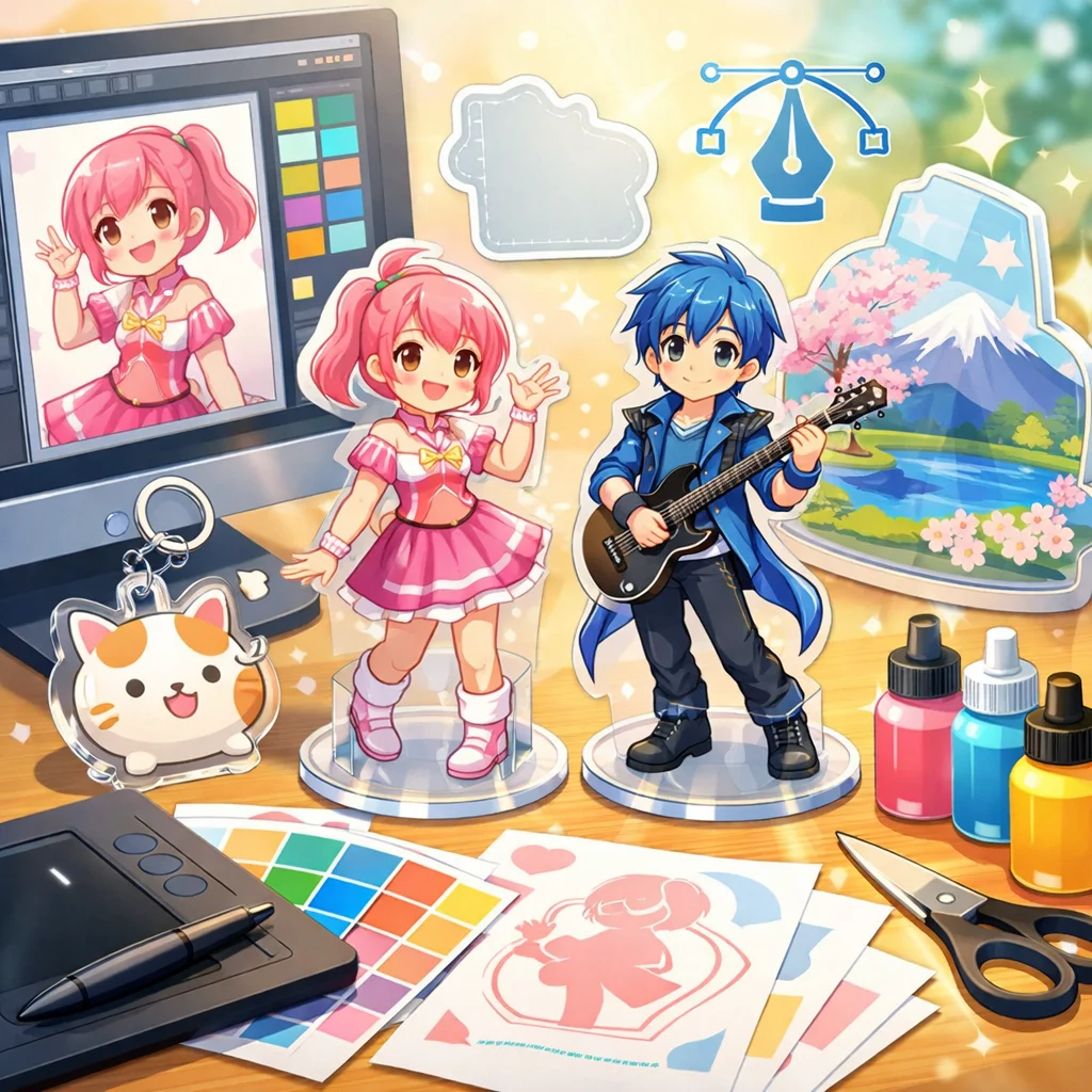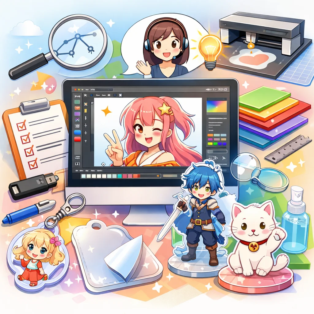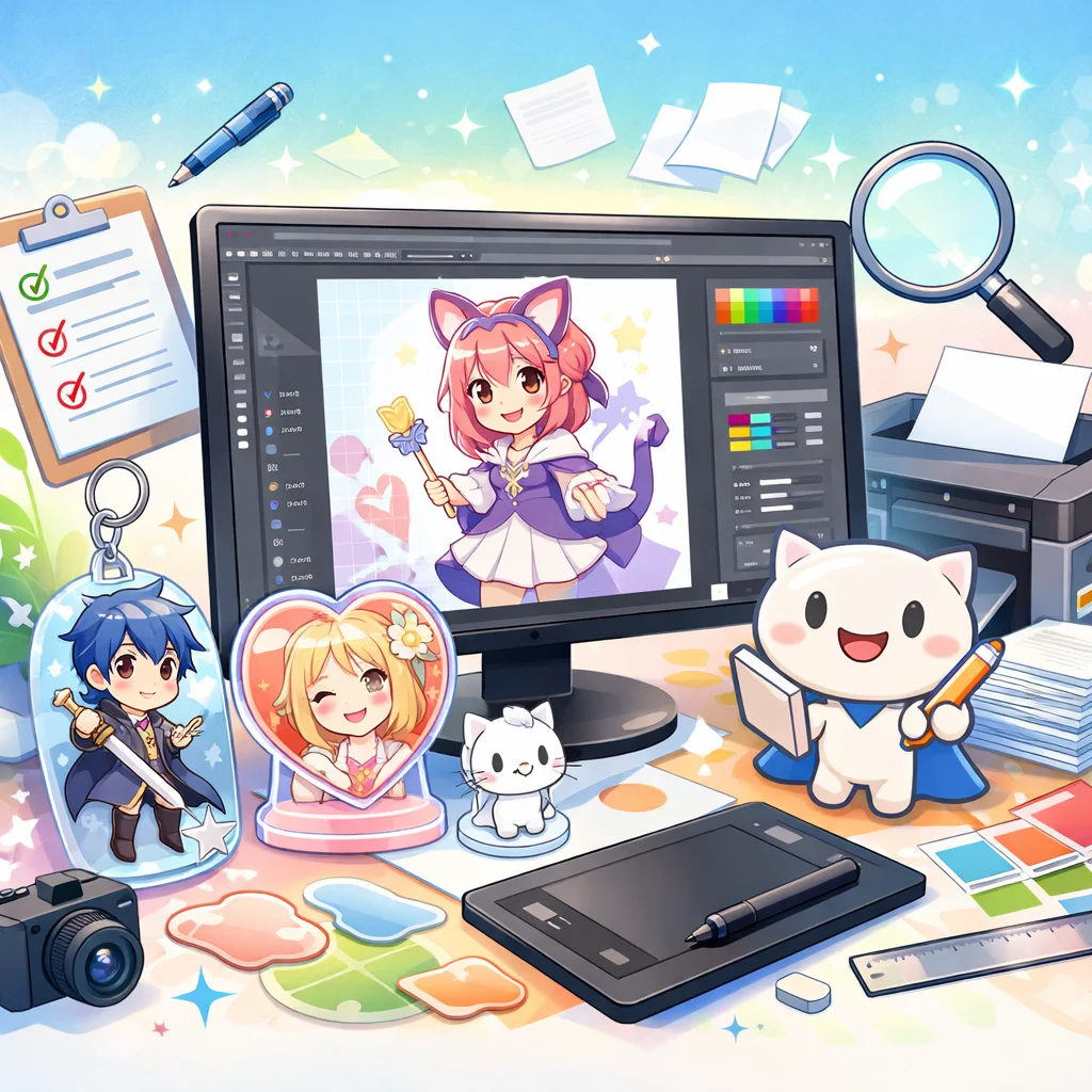 アクリルグッズの制作プロセスでは、しっかりとしたデザインとデータ準備が必要です。特に、視認性と魅力的な色合いを意識してください。