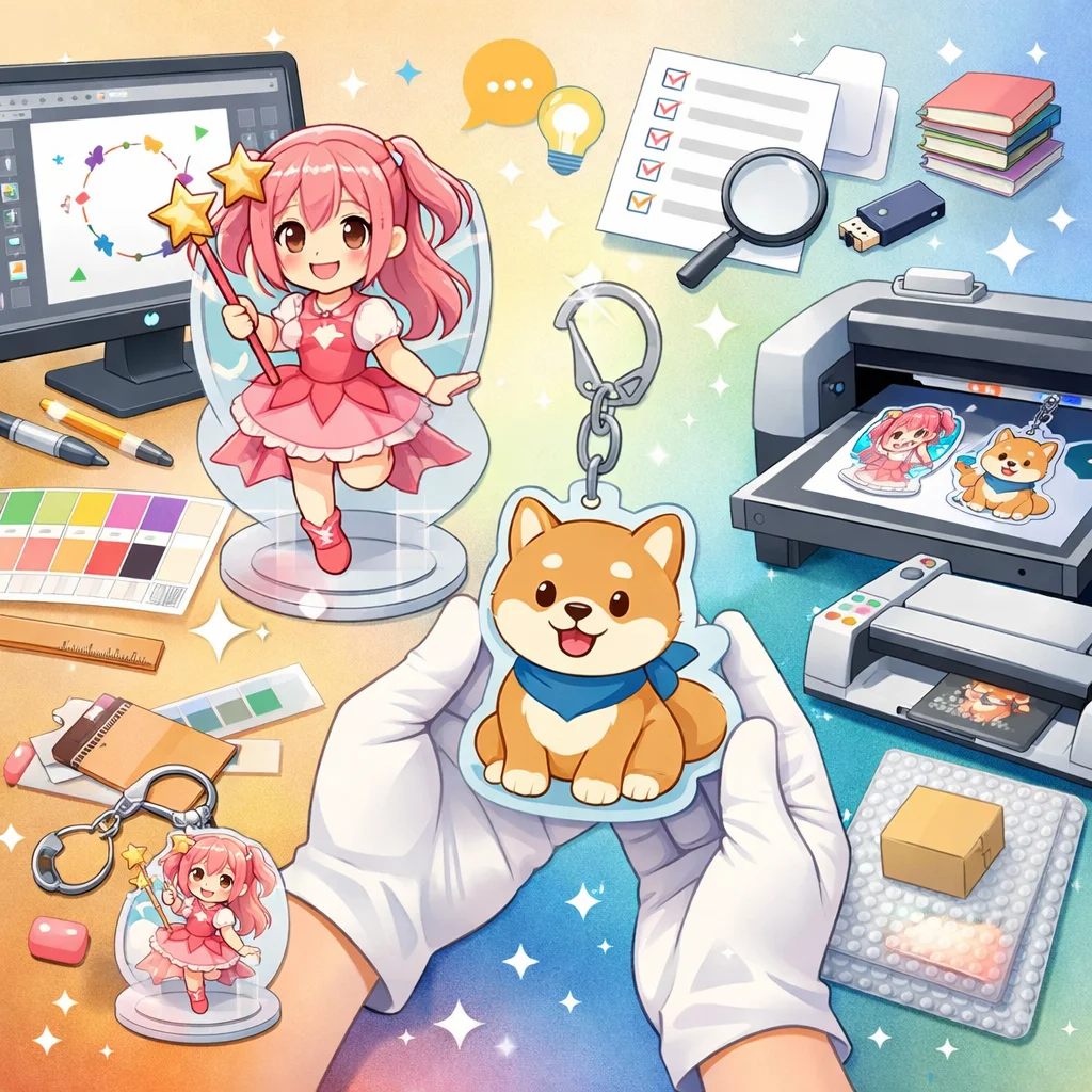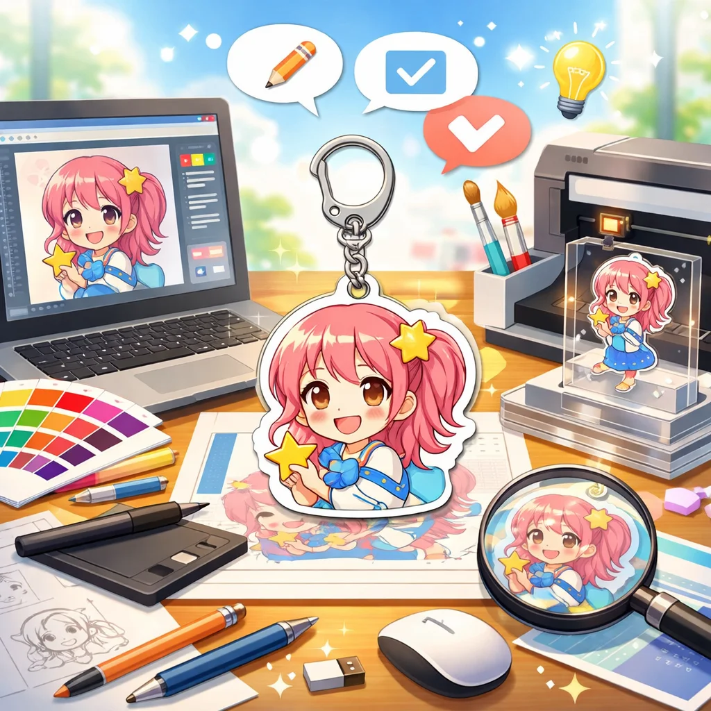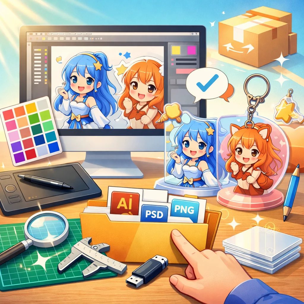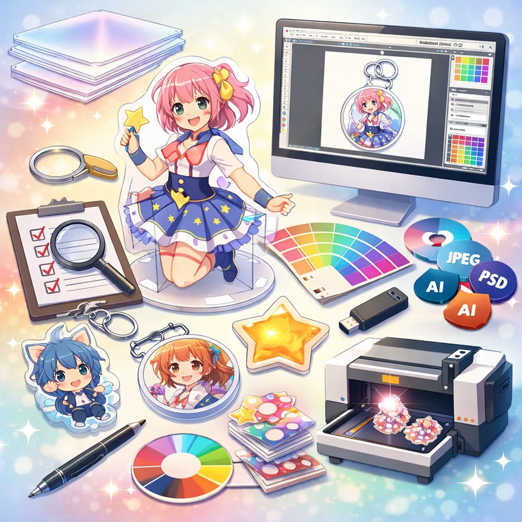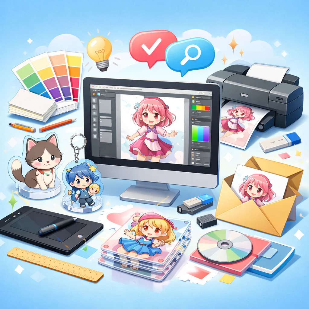 アクリルグッズの制作プロセスでは、しっかりとしたデザインとデータ準備が必要です。特に、視認性と魅力的な色合いを意識してください。