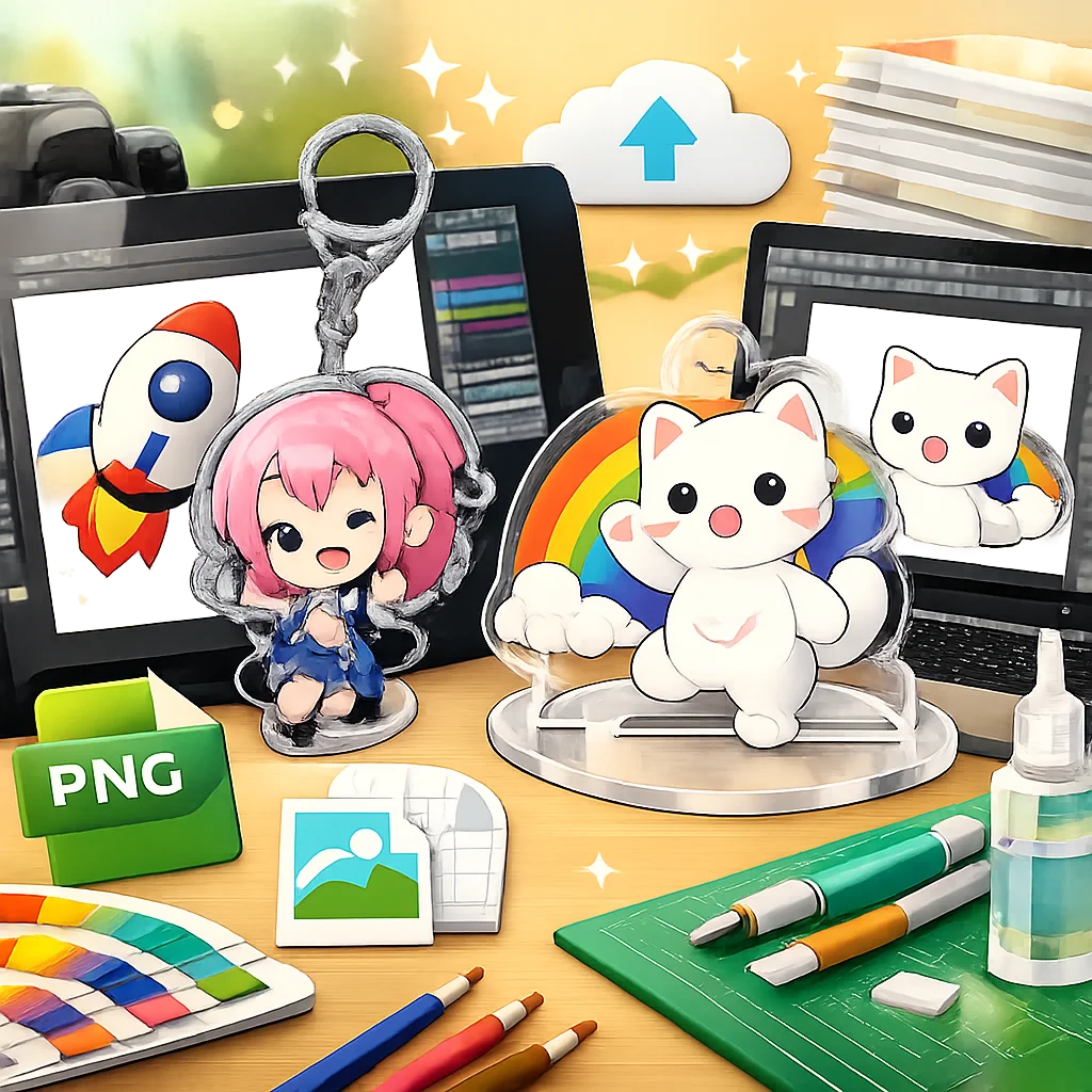 このように、入稿サポートを利用する際はそれぞれのステップを正確に踏むことで、効率よくアクリルグッズのデザインが完成します。特にデザインの質が商品価値を決定するため、時間をかけて丁寧にPNGデータを作成することが非常に重要です。入稿サポートを賢く利用し、理想的なアクリルグッズを手に入れましょう。