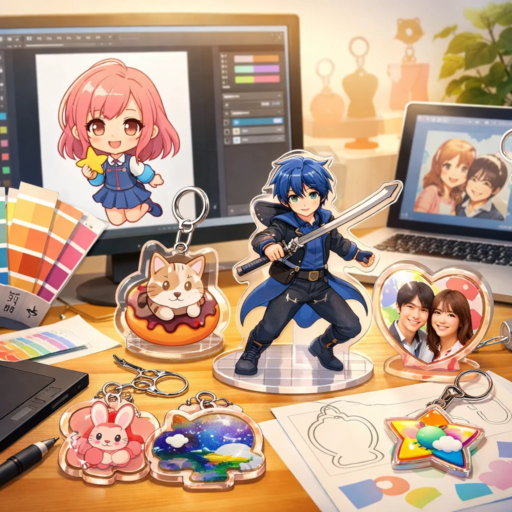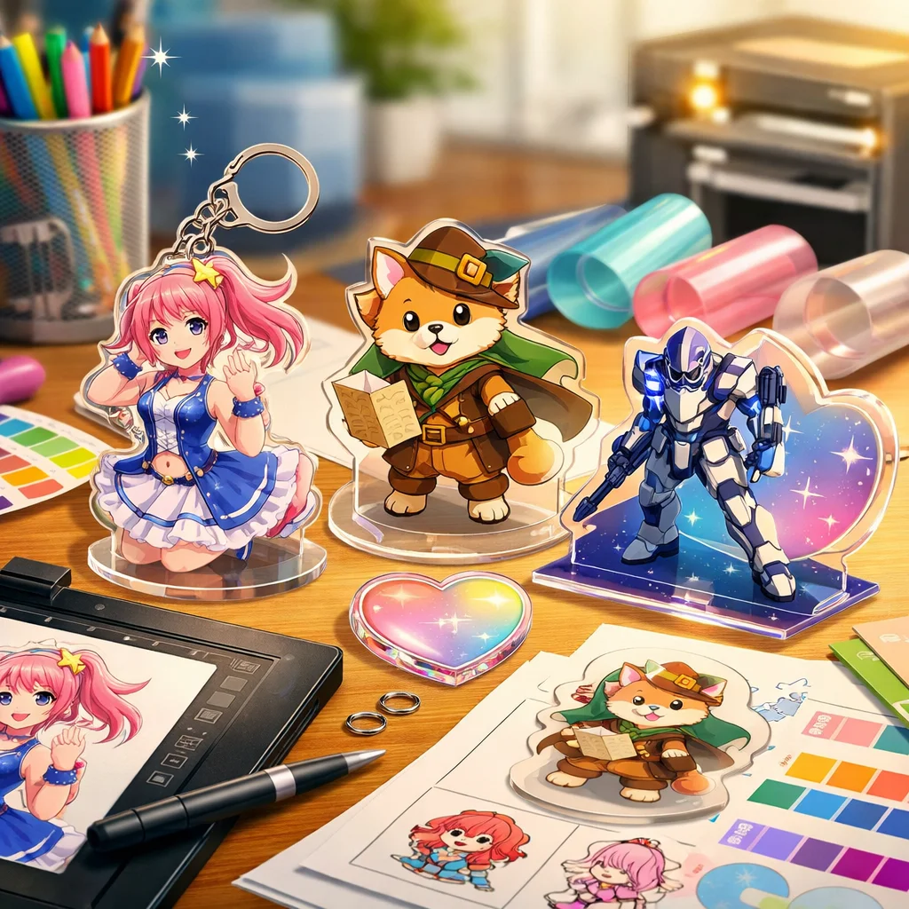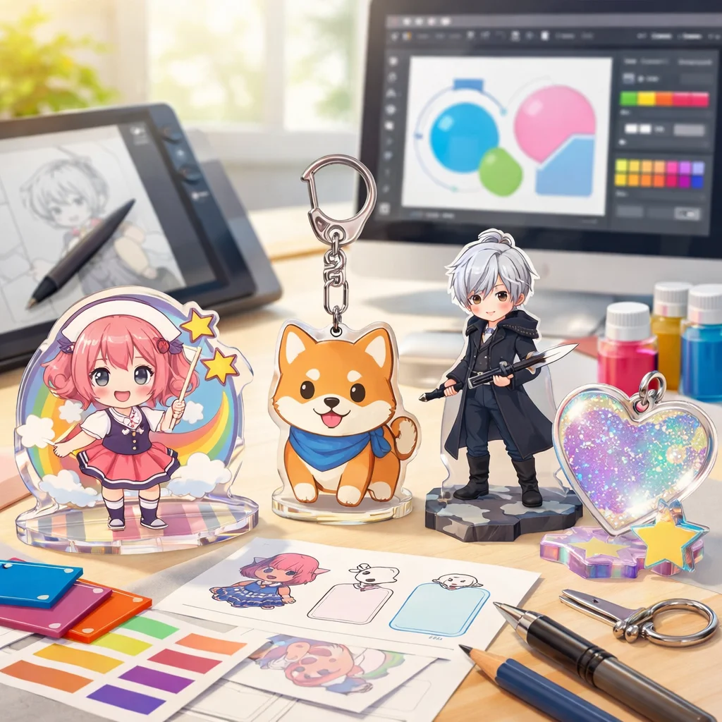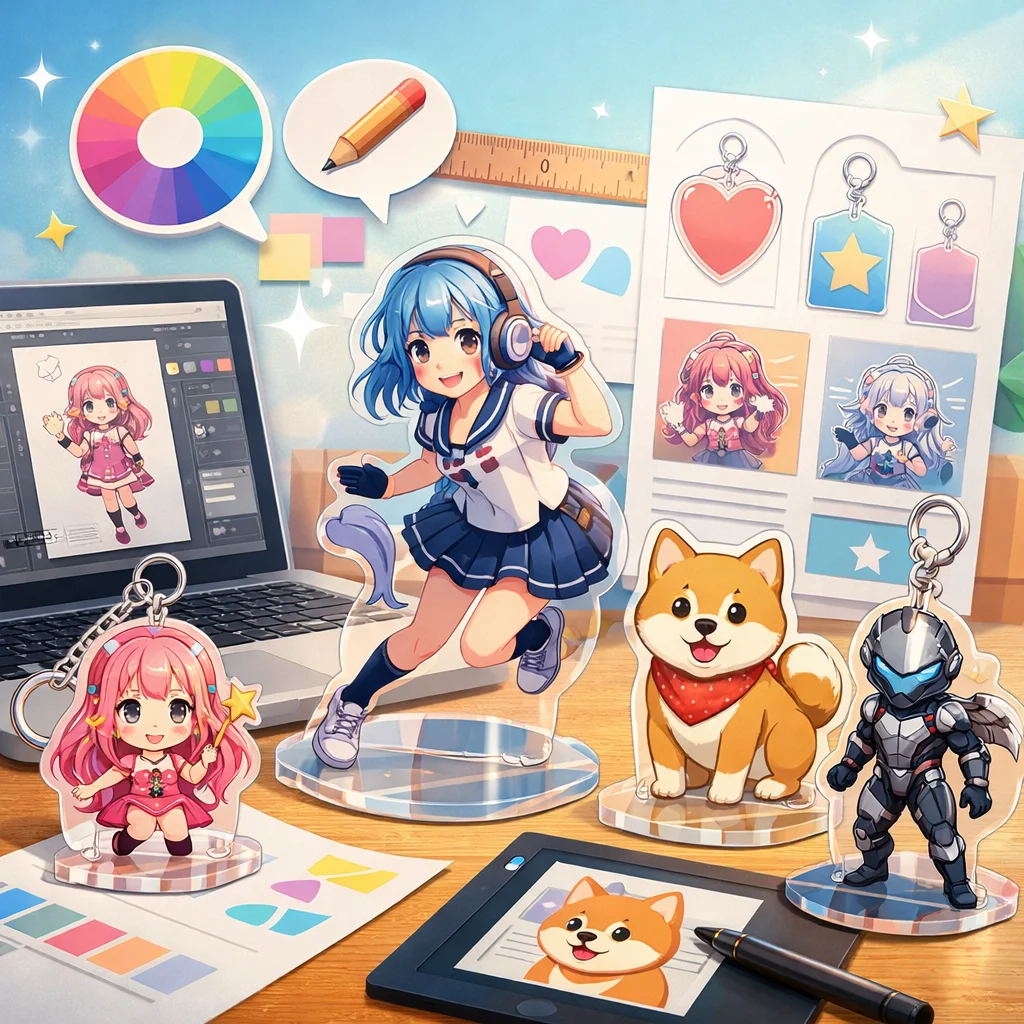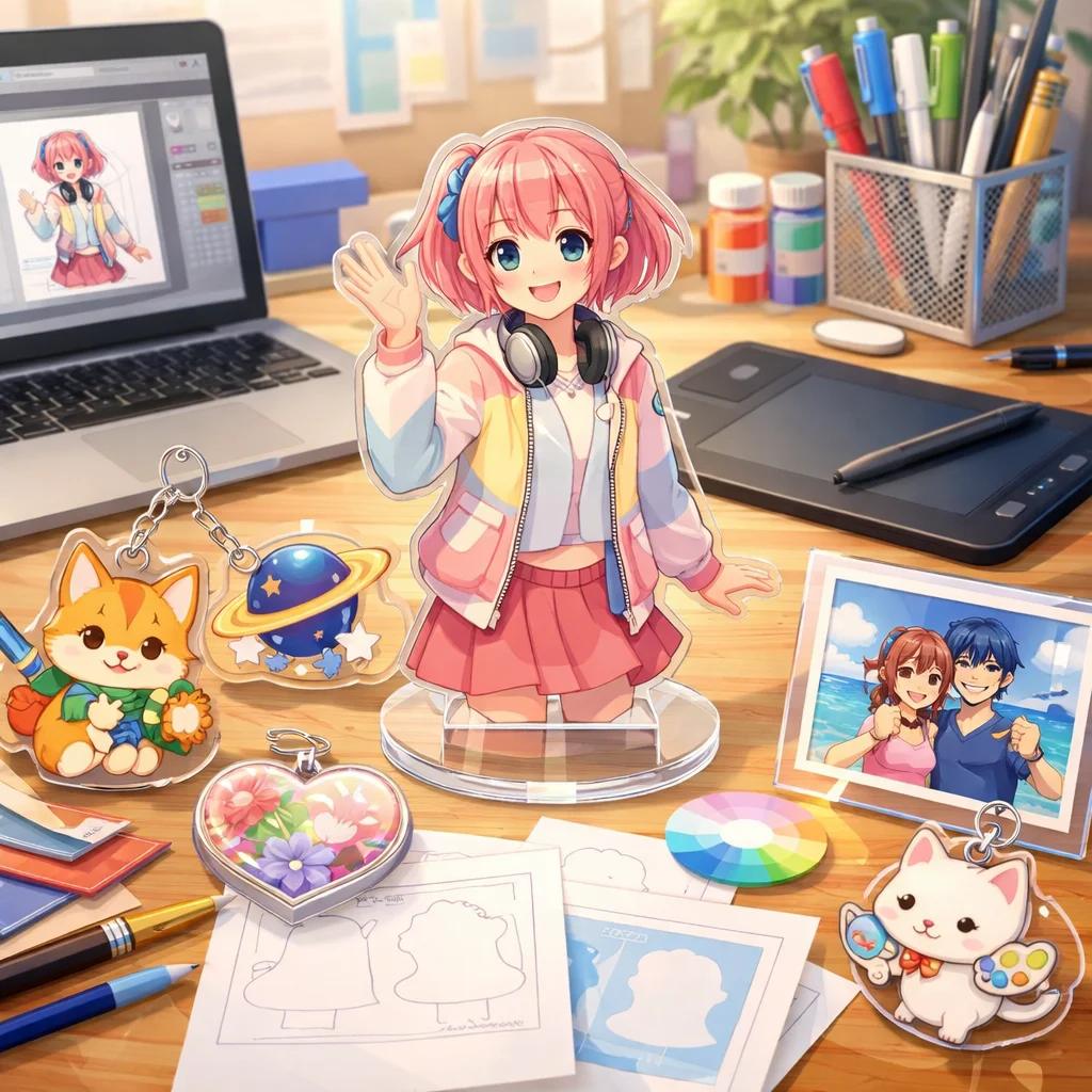 アクリルグッズは、そのデザインの幅広さと魅力から多くのシーンで活躍しています。形状や印刷表現、付加加工、ギミック、シリーズ展開など、さまざまな要素を組み合わせることで、個性豊かな商品を作り出せます。ぜひ、これらのアイデアを参考にして、オリジナルなアクリルグッズを制作してみてください。