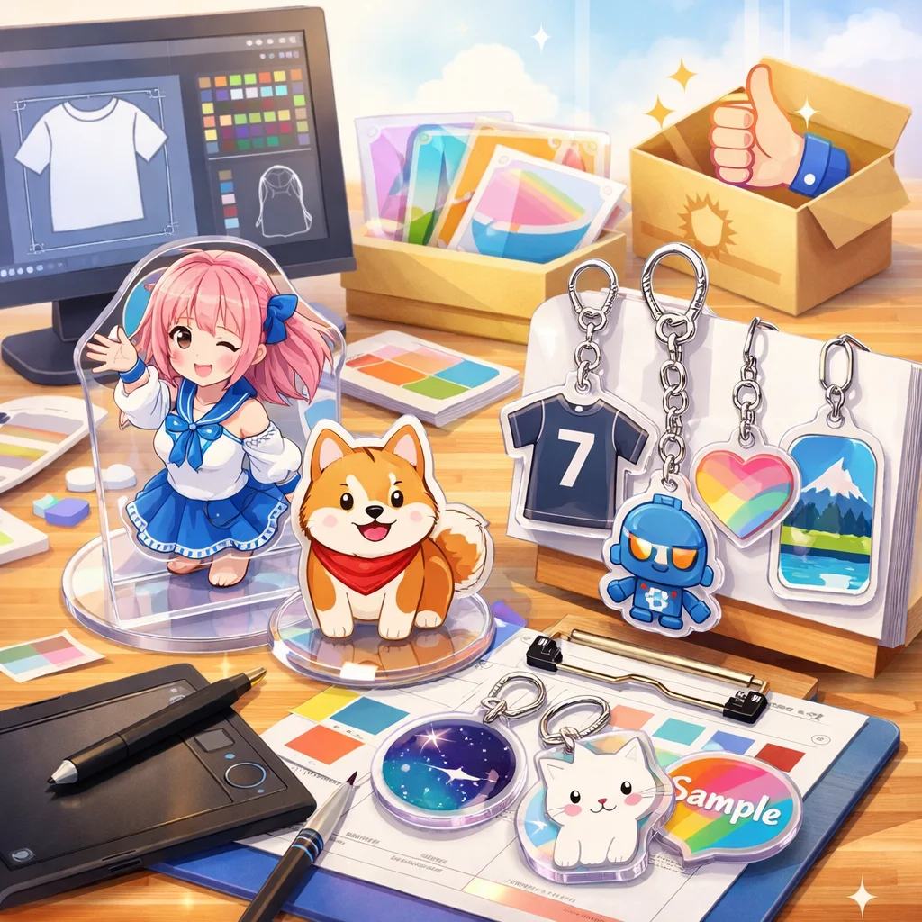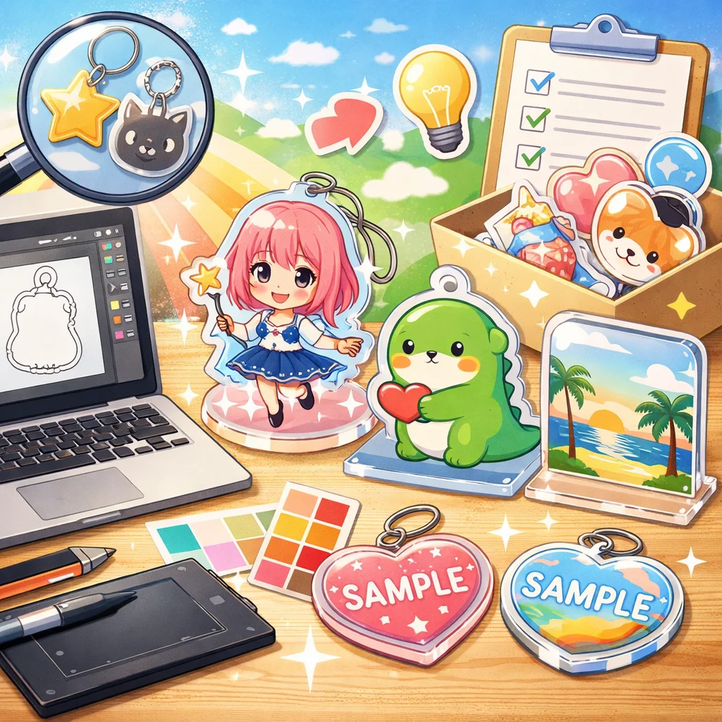 アクリルグッズの制作は、デザインの入稿サポートを活用することで、より効果的に進められます。品質やコストを重視しながら、各サービスの無料サンプルを比較検討することで、自信を持ってプロジェクトを進めてください。成功を祈っています!