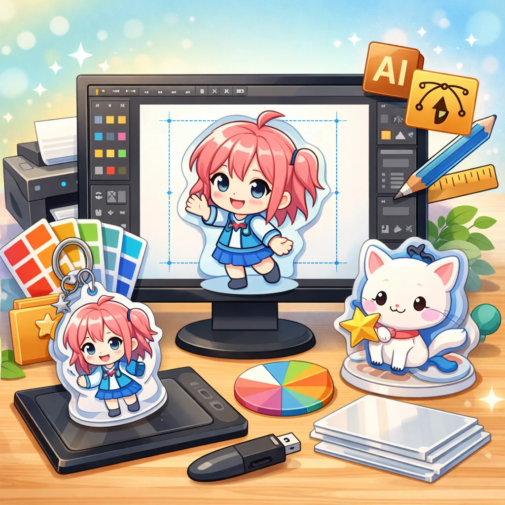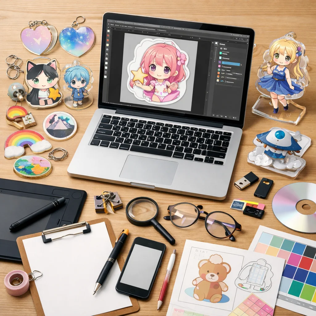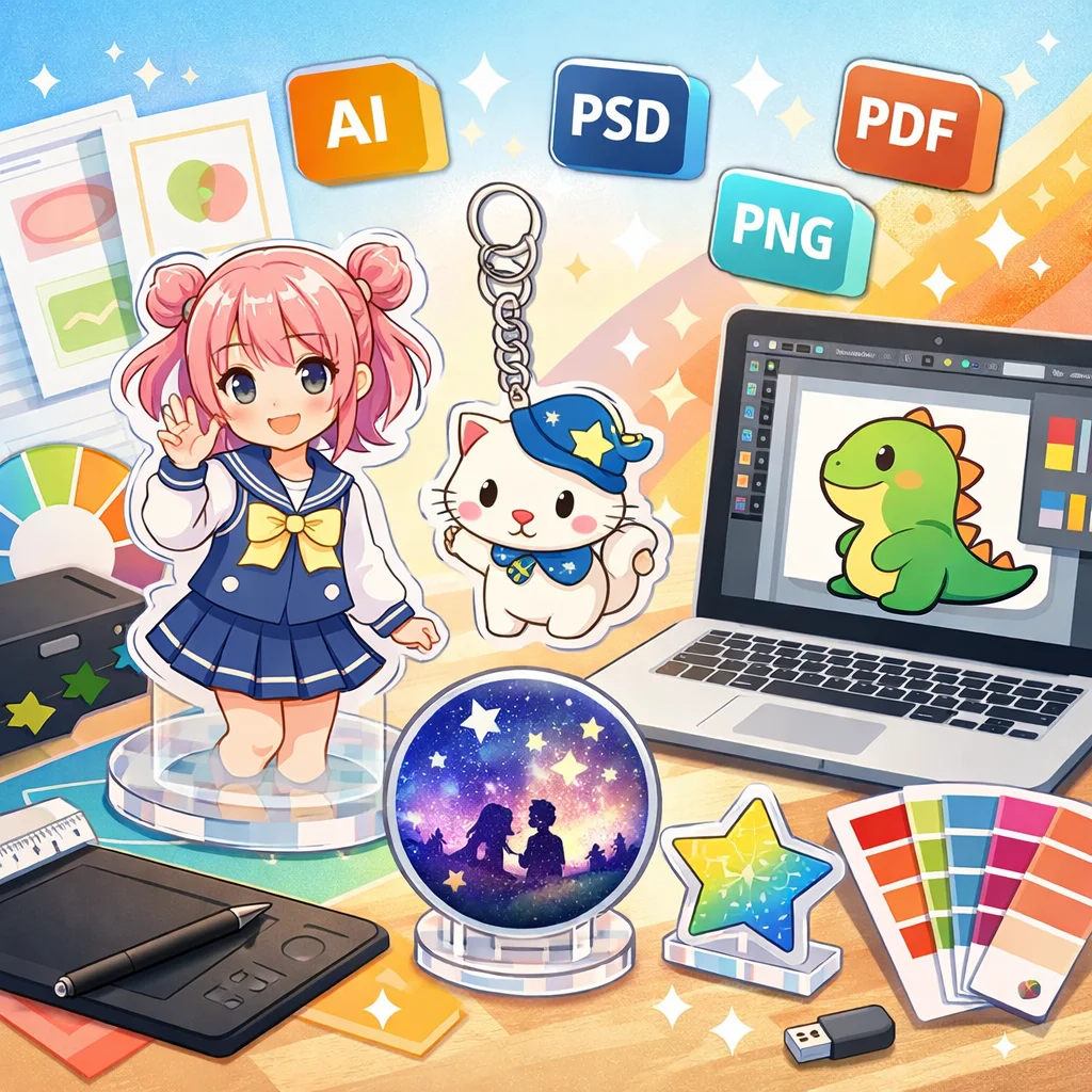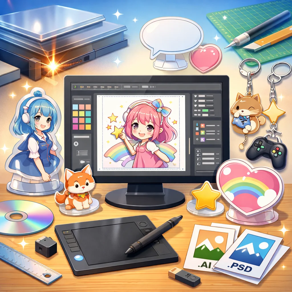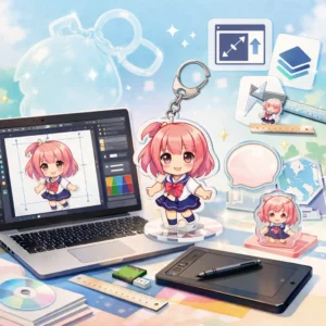 アクリルグッズのデザインデータ作成は、適切な入稿形式の選択が鍵となります。印刷所の指示をしっかり確認し、高品質な仕上がりを目指しましょう。さまざまな形式の特性を理解し、元のデザインの意図を損なわないよう工夫を重ねていきましょう。