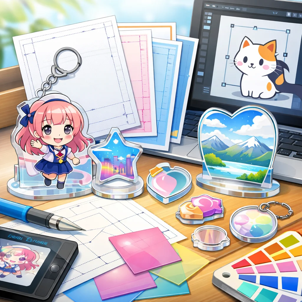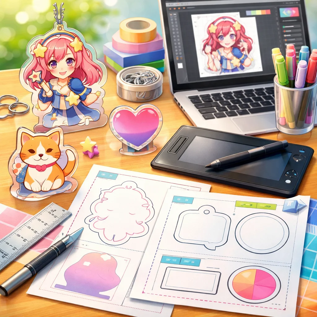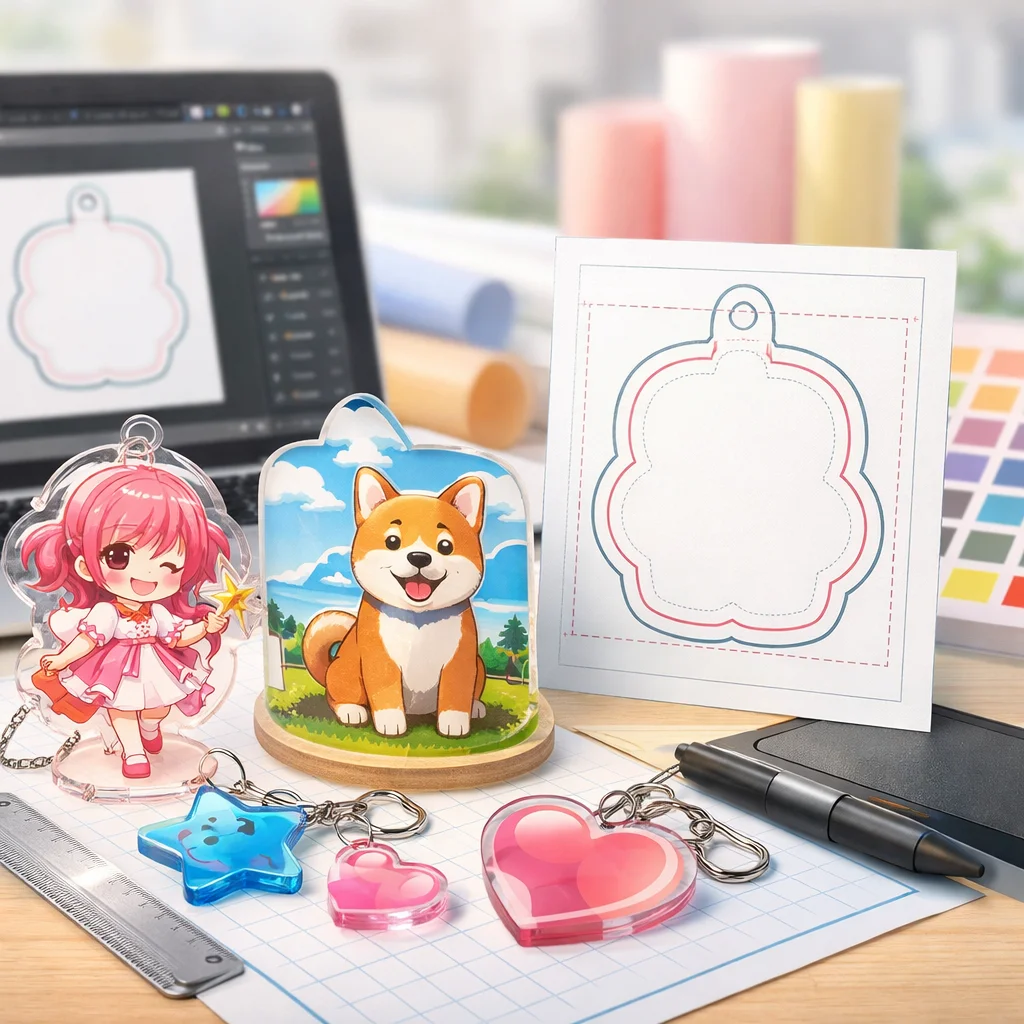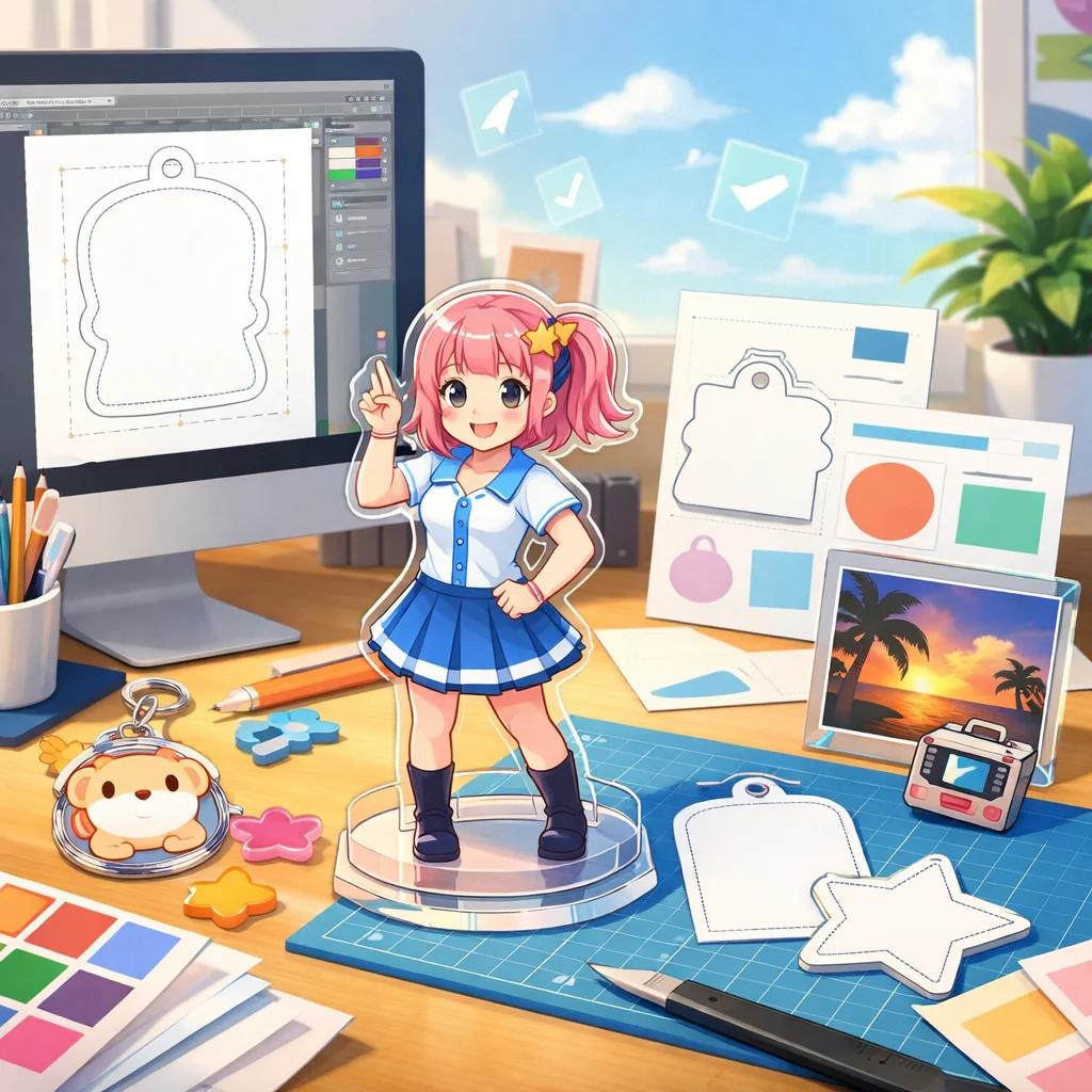 アクリルグッズのデザインは楽しく、クリエイティブなプロセスです。専用テンプレートを活用することで、制作がよりスムーズになります。印刷範囲やカット線など、基本的なポイントを押さえて、魅力的なアクリルグッズを作り上げてください。皆さんのアイデアが素敵な作品に仕上がることを願っています。