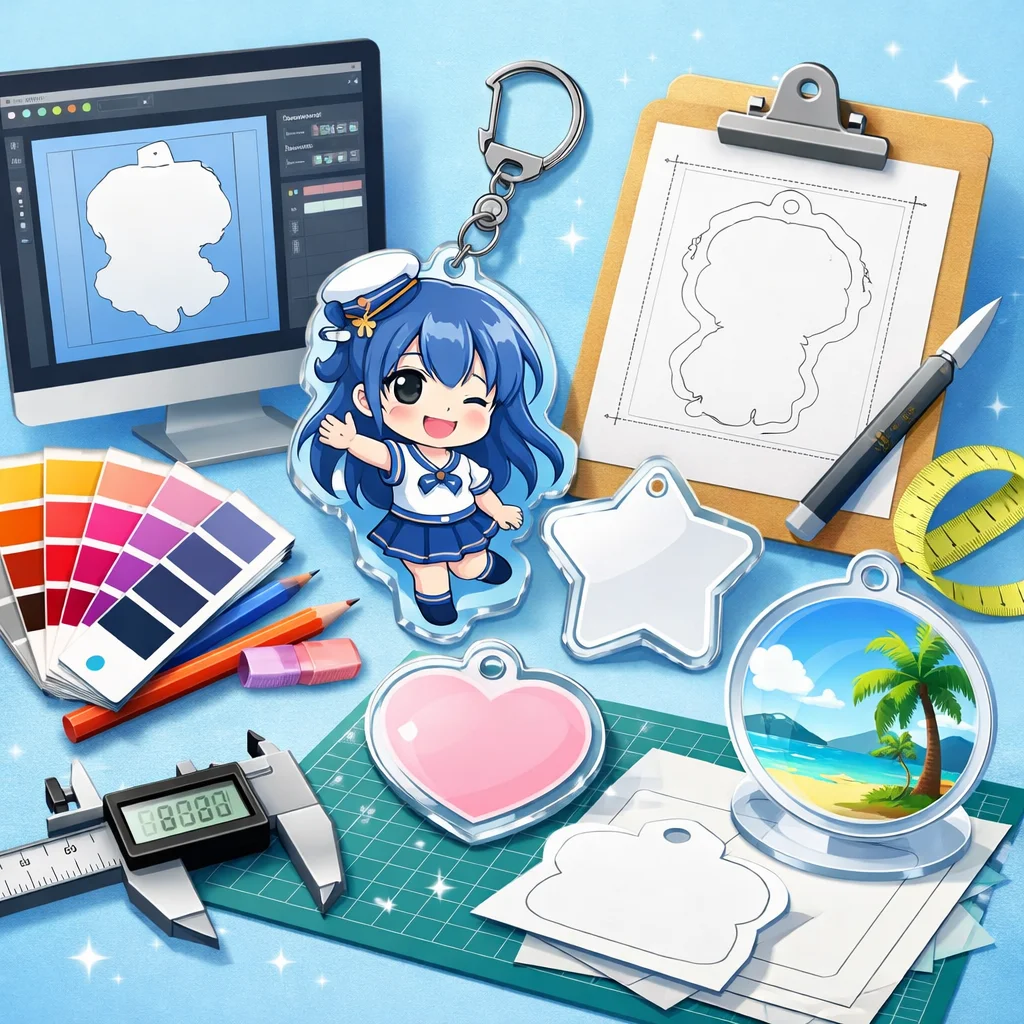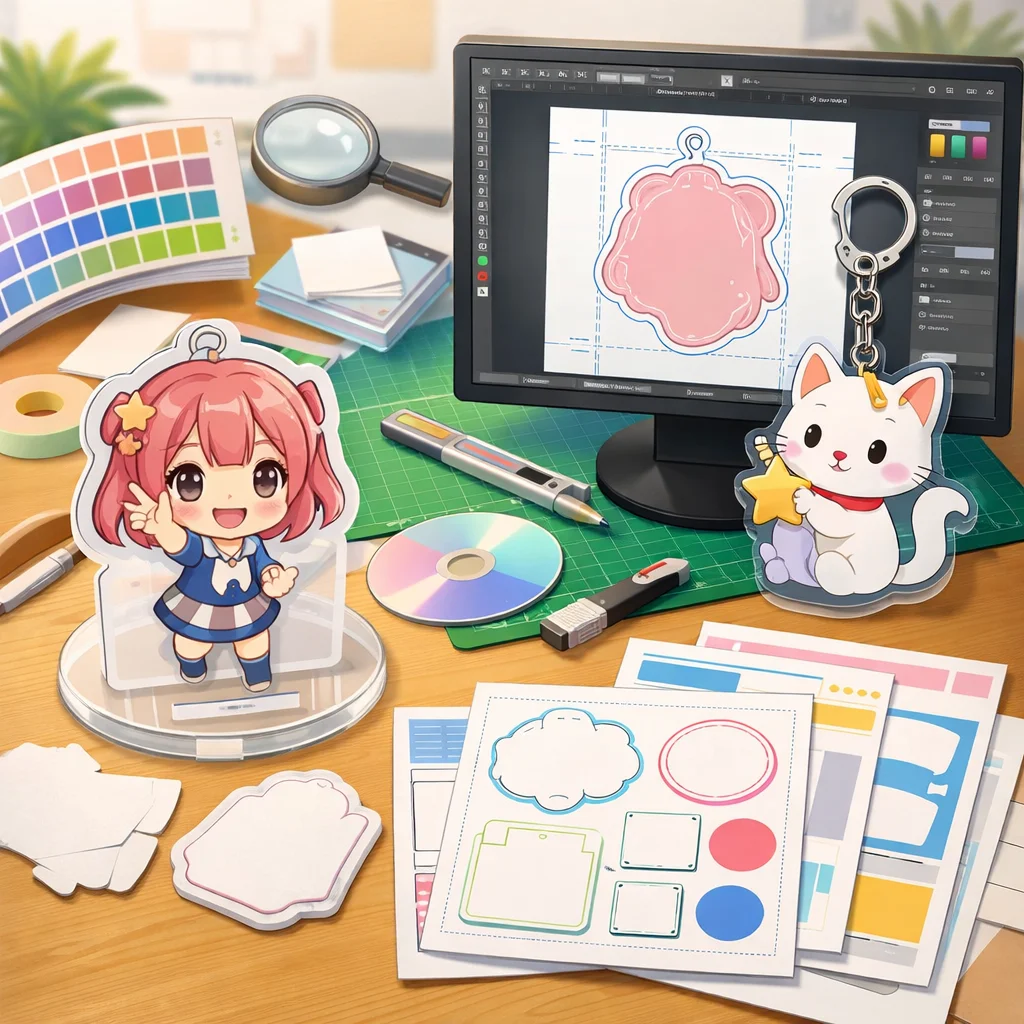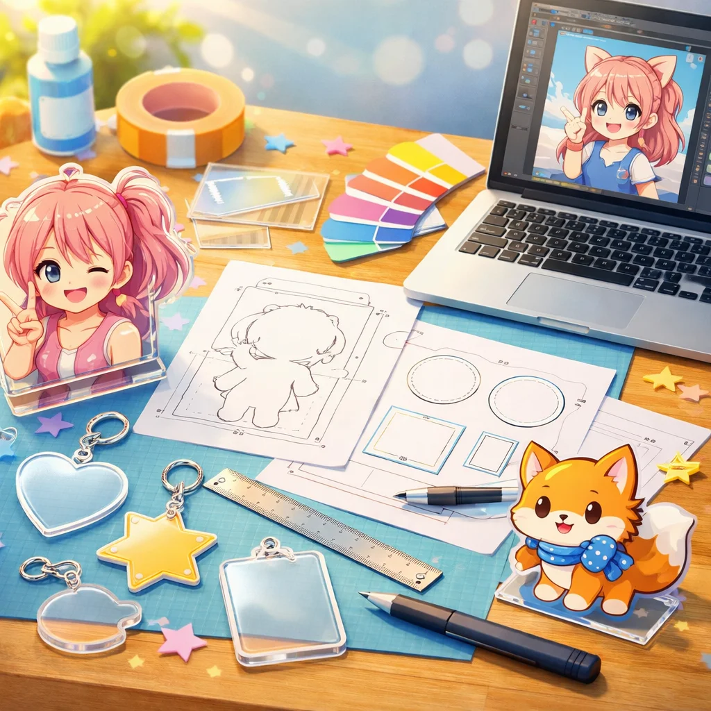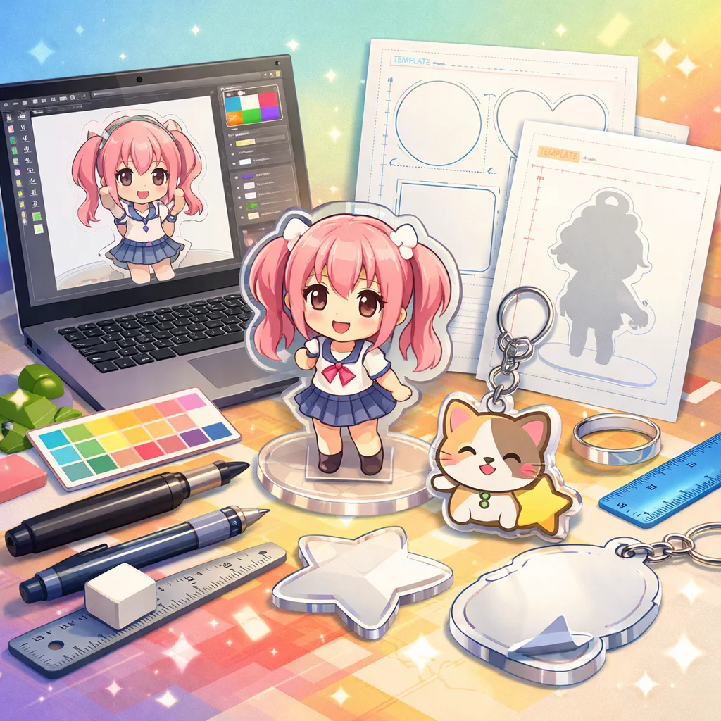 アクリルグッズのデザインは楽しく、クリエイティブなプロセスです。専用テンプレートを活用することで、制作がよりスムーズになります。印刷範囲やカット線など、基本的なポイントを押さえて、魅力的なアクリルグッズを作り上げてください。皆さんのアイデアが素敵な作品に仕上がることを願っています。