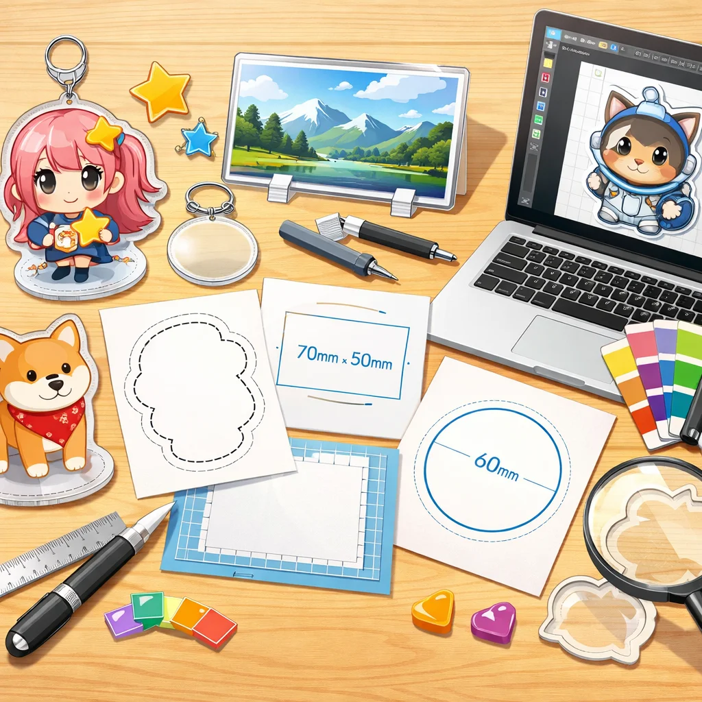 アクリルグッズのデザインには、テンプレートとサイズ選定が重要です。テンプレートはカットラインや塗り足しの管理を可能にし、適切なサイズ選定は仕上がりやコスト、見栄えに影響します。用途に応じたサイズを選び、効果的なデザインを実現してください。
