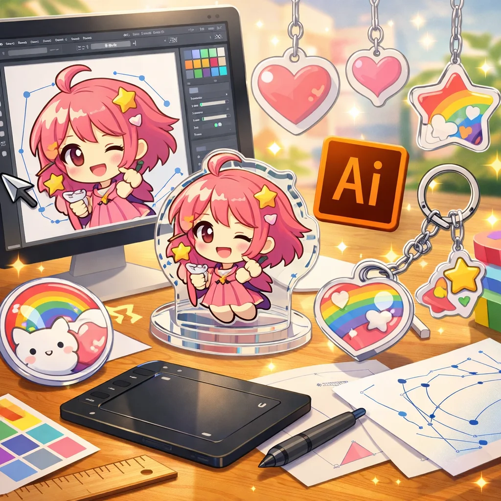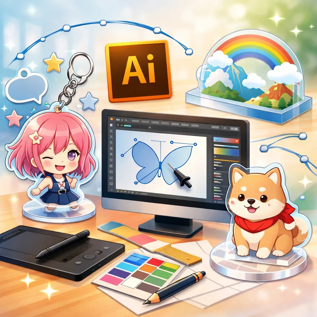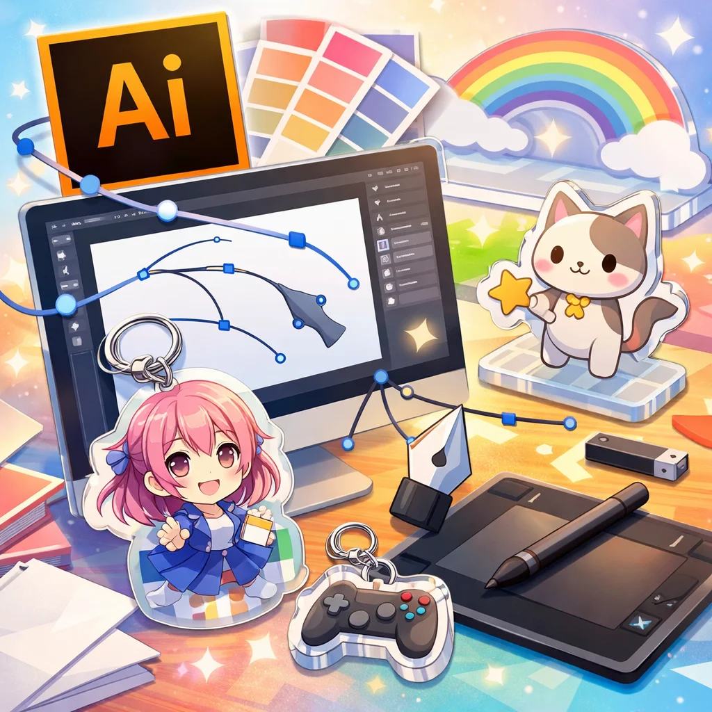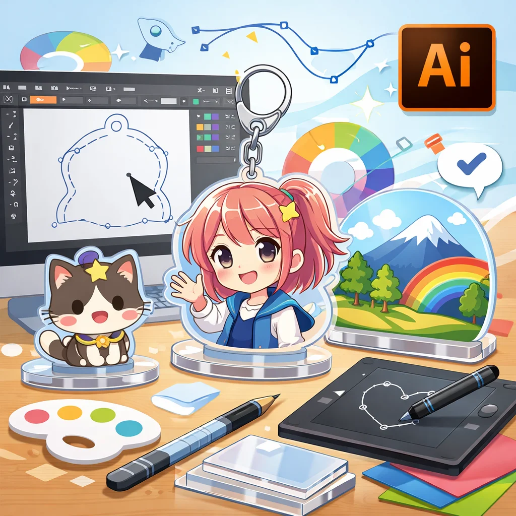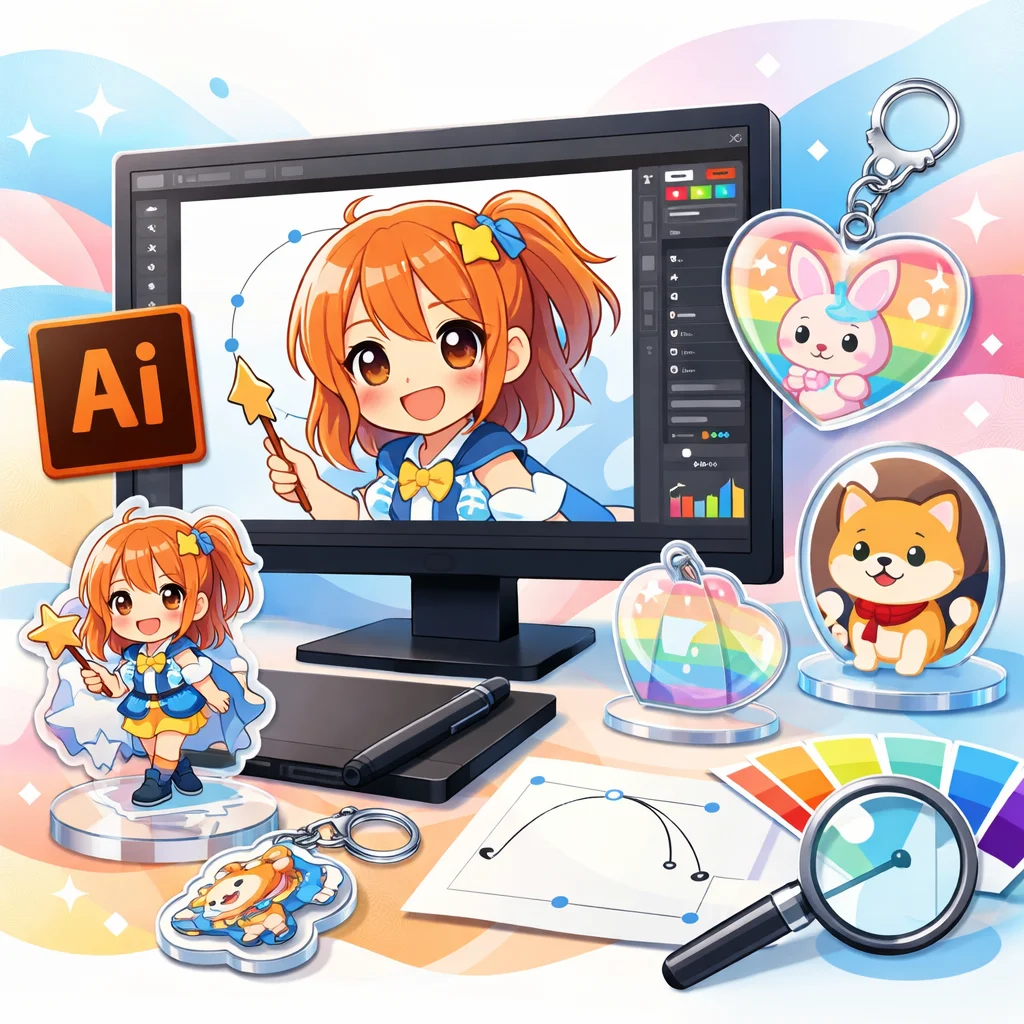 アクリルグッズのデザイン制作において、Illustratorは非常に重要な役割を果たします。特に、アクリルキーホルダーなどの製作時には、Illustratorを用いて作成したデータが各工程でどのように活用されるかを理解することが、スムーズな制作プロセスに繋がります。