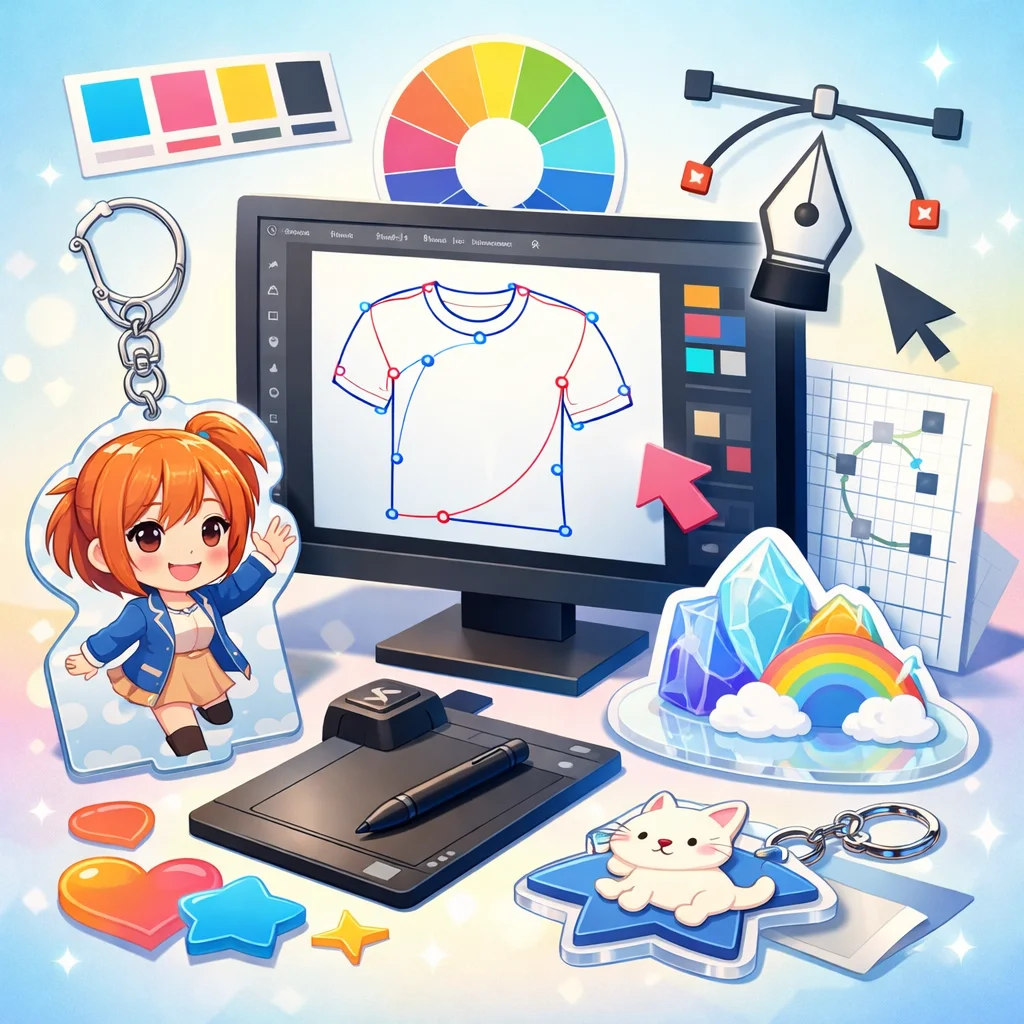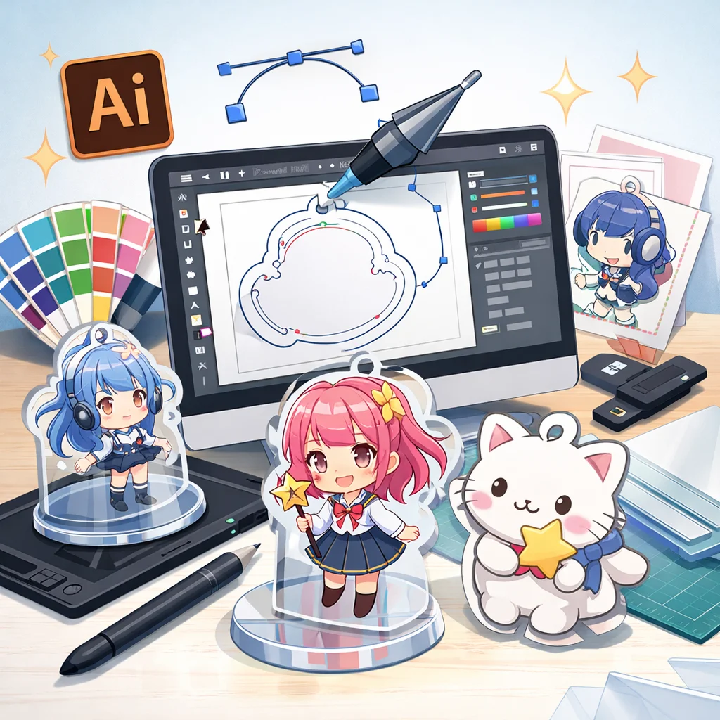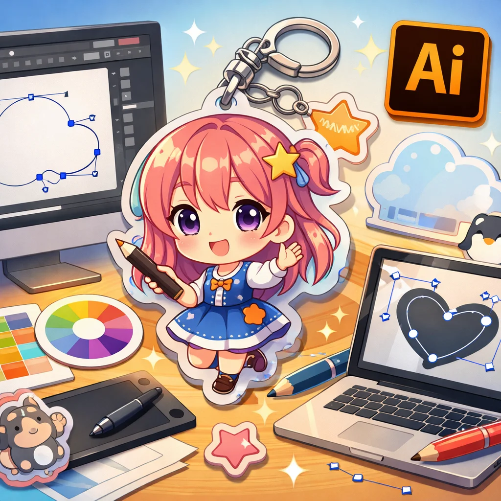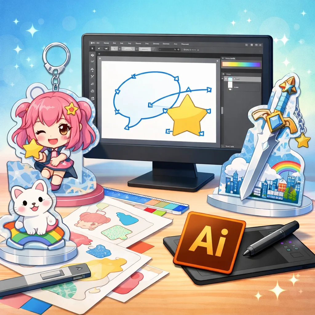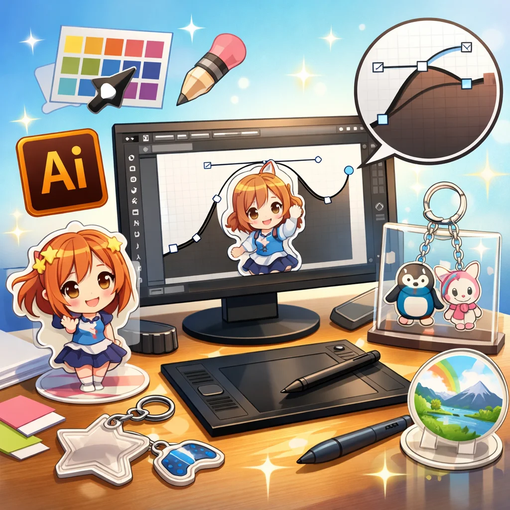 アクリルグッズのデザイン制作において、Illustratorは非常に重要な役割を果たします。特に、アクリルキーホルダーなどの製作時には、Illustratorを用いて作成したデータが各工程でどのように活用されるかを理解することが、スムーズな制作プロセスに繋がります。