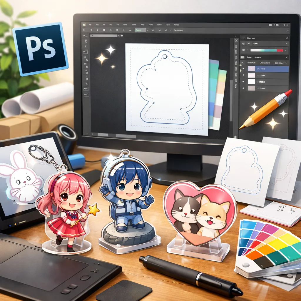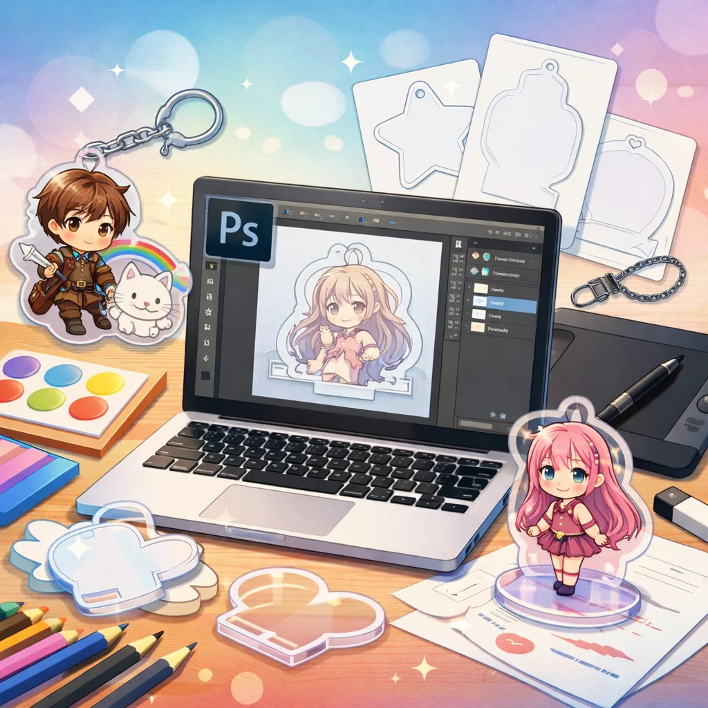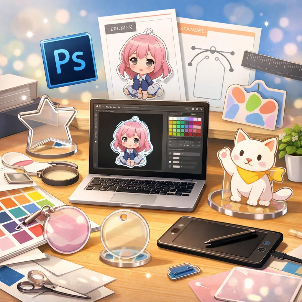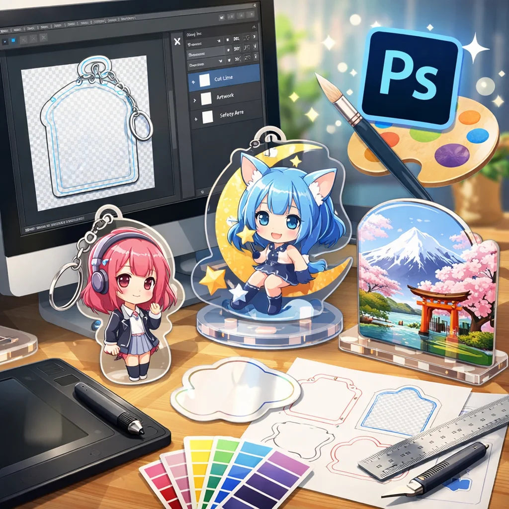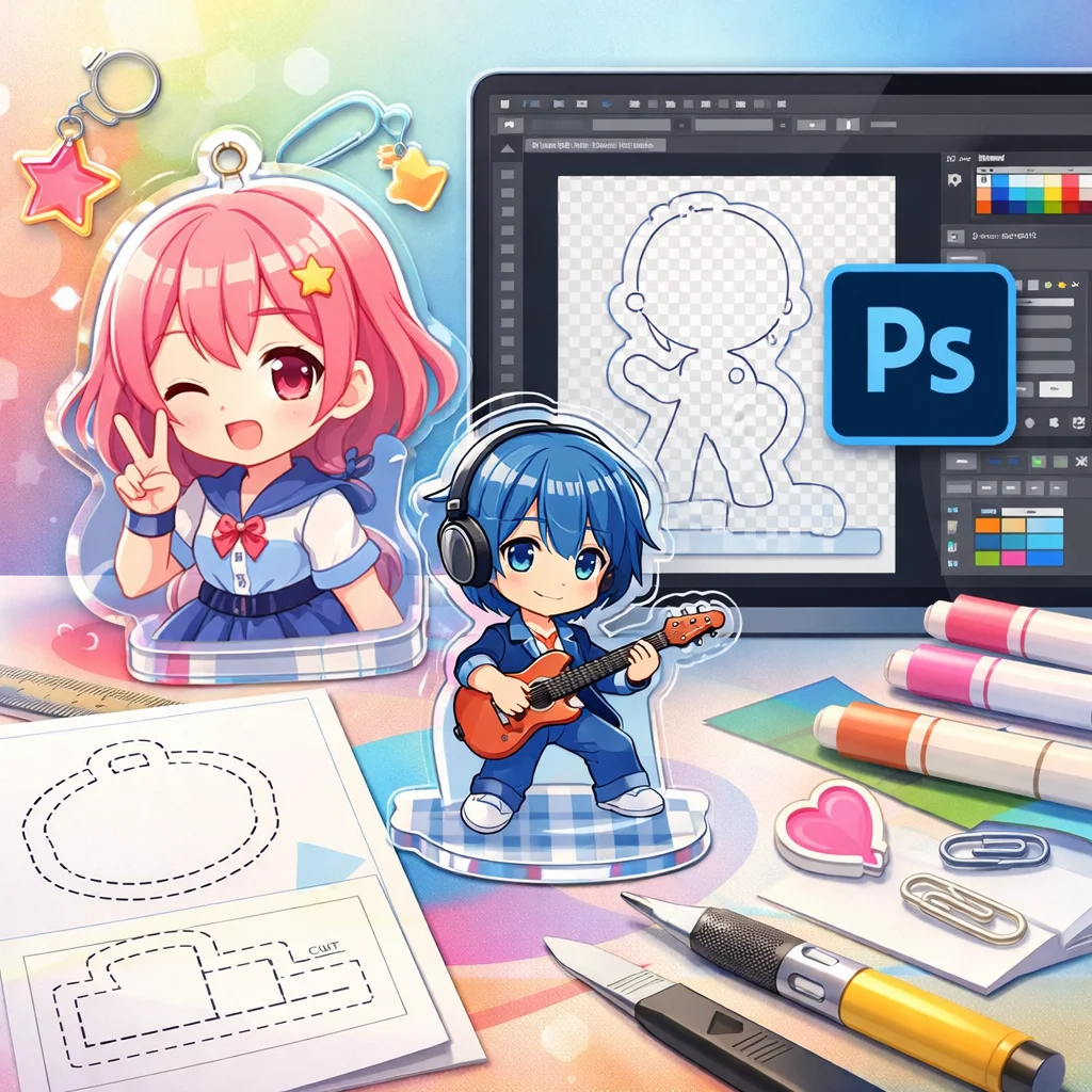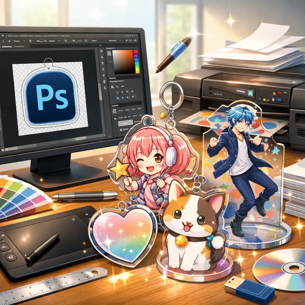 **Photoshop**を用いた**アクリルグッズ**の制作は、テンプレートの入手から始まり、デザイン、白版作成、カットライン確認、入稿データ書き出し、入稿サポート、校了までの総合的なプロセスです。
