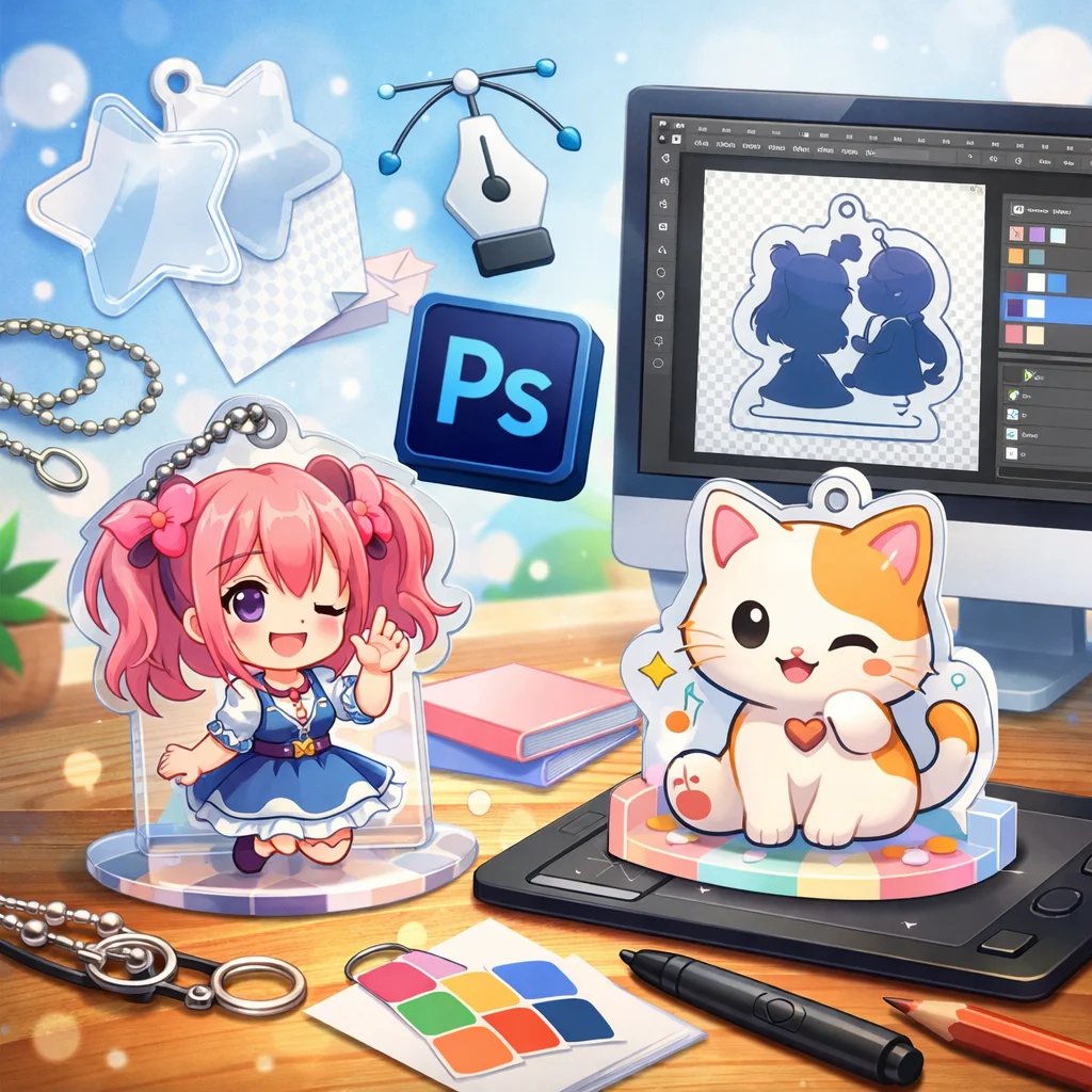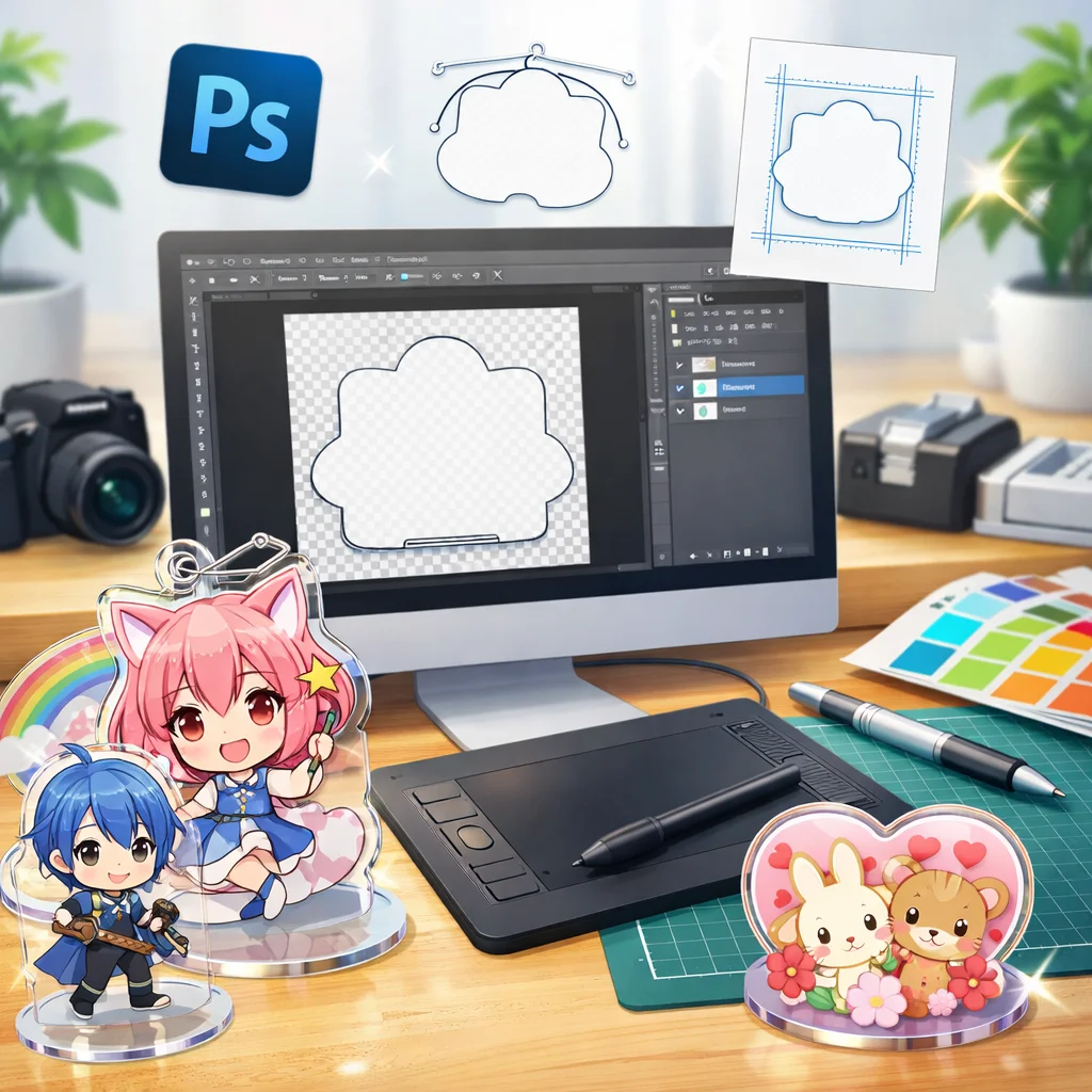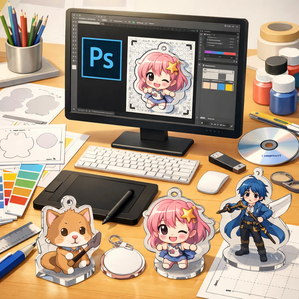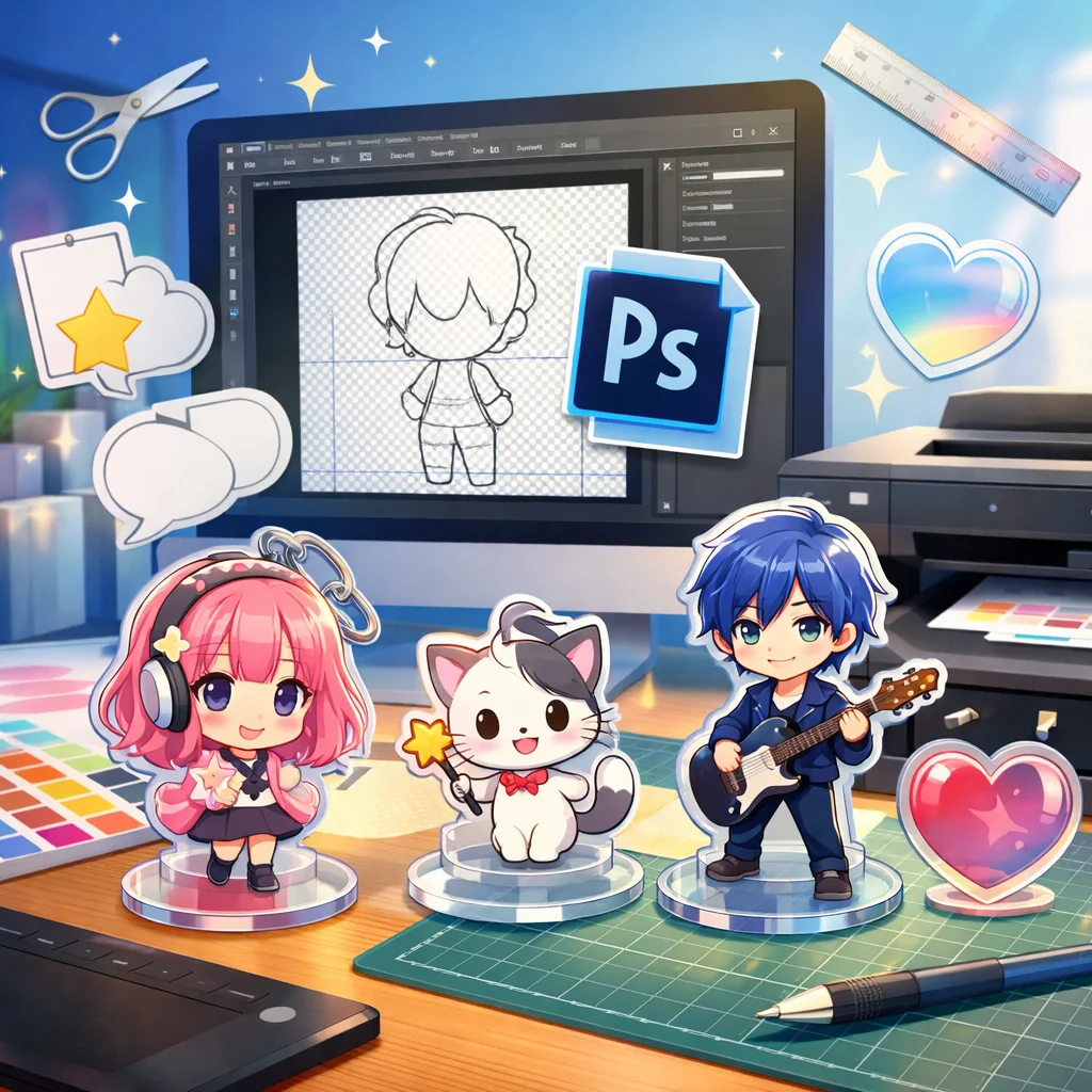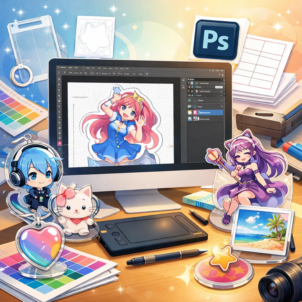 **Photoshop**を用いた**アクリルグッズ**の制作は、テンプレートの入手から始まり、デザイン、白版作成、カットライン確認、入稿データ書き出し、入稿サポート、校了までの総合的なプロセスです。
