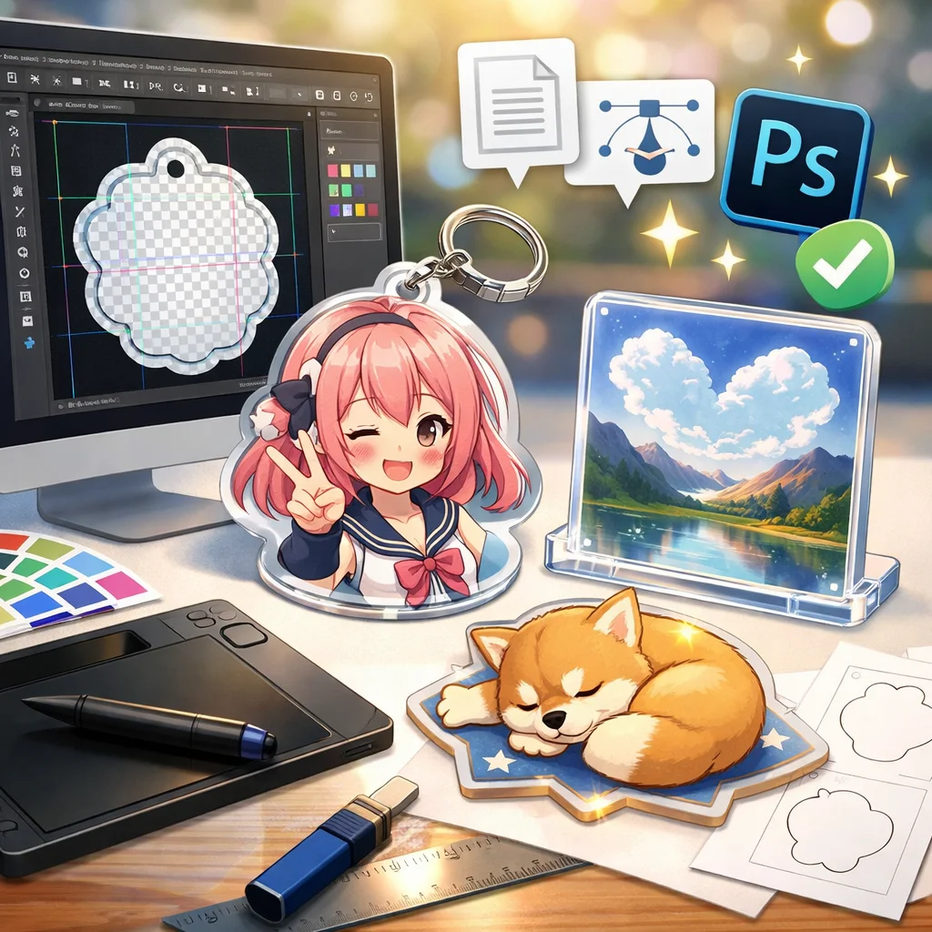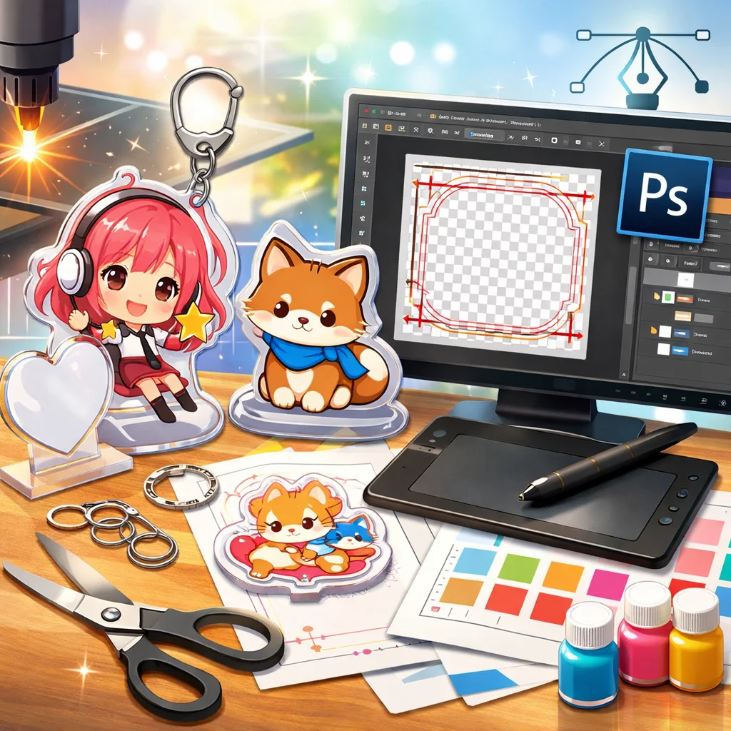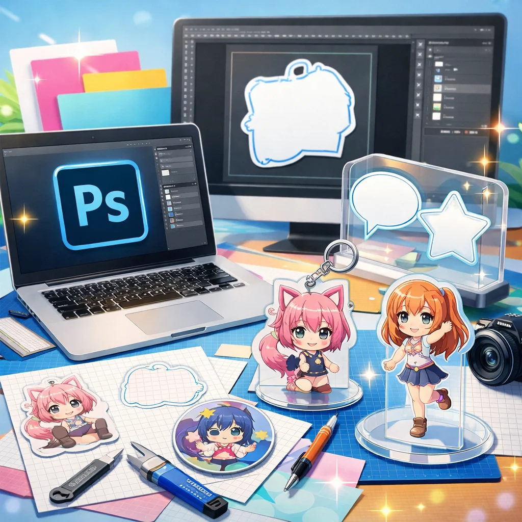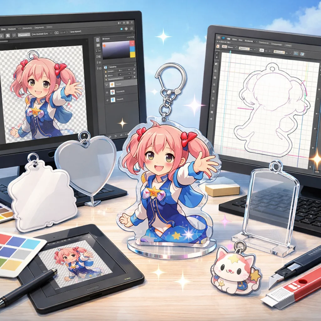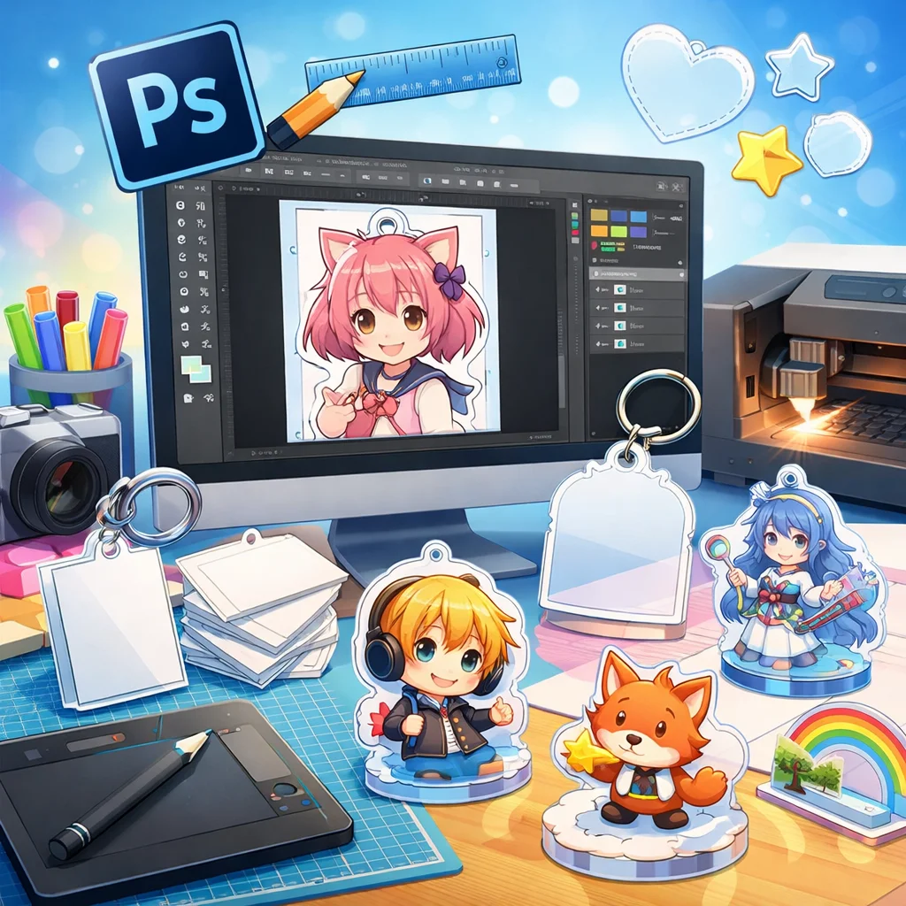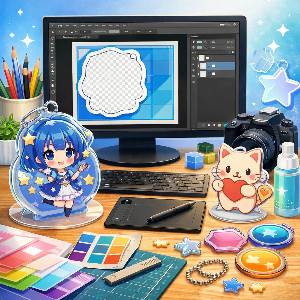 **Photoshop**を用いた**アクリルグッズ**の制作は、テンプレートの入手から始まり、デザイン、白版作成、カットライン確認、入稿データ書き出し、入稿サポート、校了までの総合的なプロセスです。